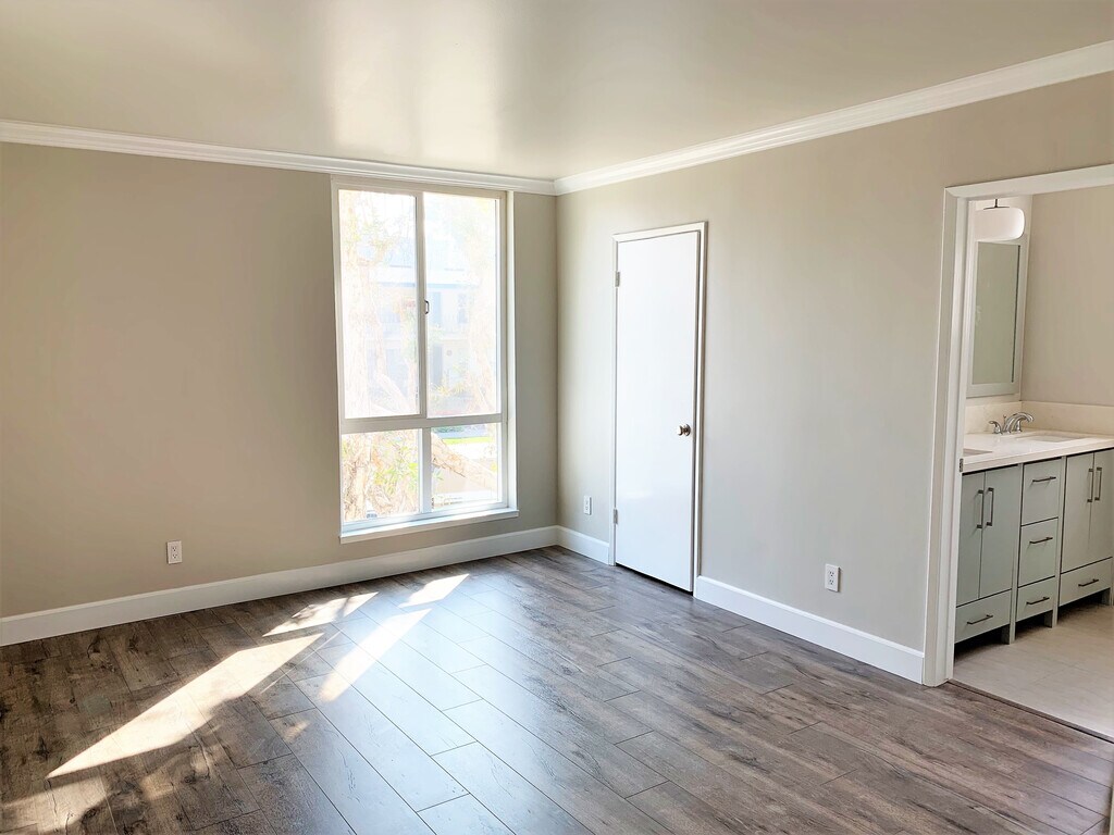 Light, bright front unit in a quiet condo building on the north-side of Montana Ave. South-Eastern exposure gives the unit great sunlight. Easy walk to the beach, 3rd Street Promenade, and shops/restaurants on Montana Avenue. Full remodel with brand new kitchen, baths, and floors. Hardwood floors throughout the unit. Kitchen has caesarstone countertops, great cabinets for storage, and high-end stainless steel Samsung appliances including a huge refrigerator, range with large oven and microwave hood, and dishwasher. Master Bedroom has ensuite bathroom with dual sinks, custom cabinets and mirrors, and a spacious walk-in closet. Guest bath has custom cabinets and mirror, caesarstone countertops, and a tub for soaking. Large front patio offers truly usable space - it's a wonderful place for brunch! One car parking included in gated garage. Shared laundry on the same floor as the unit. Quiet condo building. Common areas include a pool, hot tub, and rec room. Great school district, elementary school is Roosevelt. This is a Non-Smoking Unit, no pets are allowed.