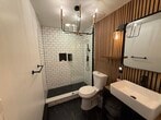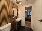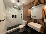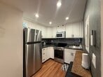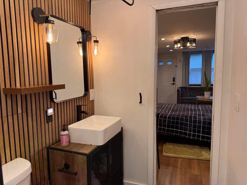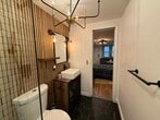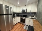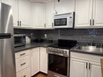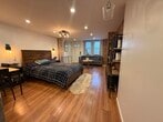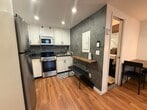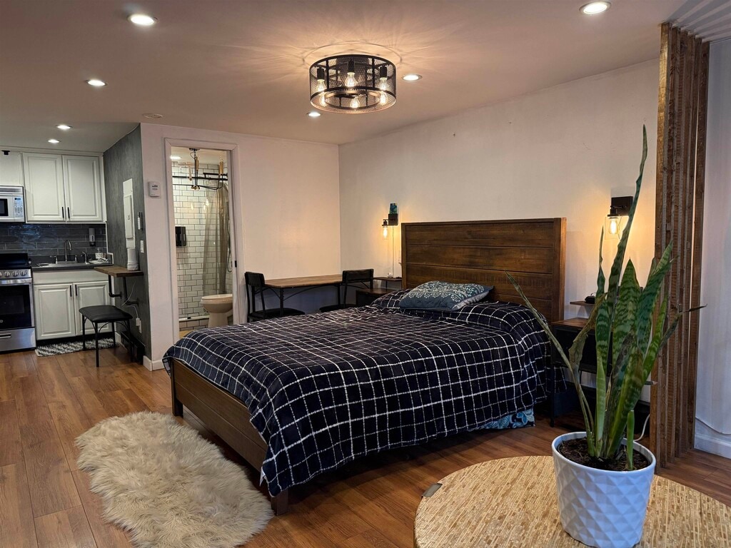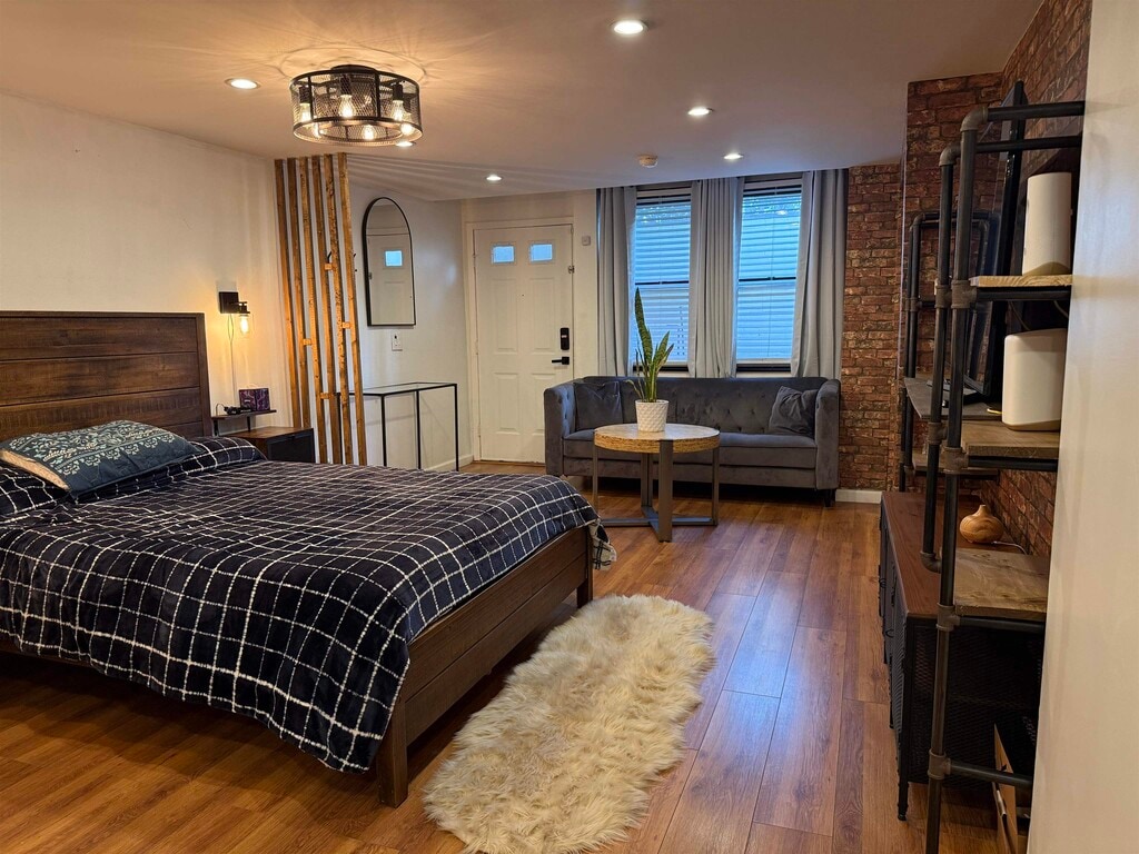 Commuter’s dream with style. This updated East Rutherford studio delivers smart design and standout finishes just minutes to NYC. Easy access to NJ Transit bus/train and major highways makes your daily commute simple and efficient. Inside, a well-executed open layout maximizes every square foot. The modern kitchen features stainless steel appliances, white shaker cabinetry, gray subway tile backsplash, and ample prep space. A custom breakfast bar with seating adds both function and character. The main living area is warm and inviting with wide-plank wood floors, recessed lighting, and a statement industrial-style ceiling fixture. A brick-accent wallpaper creates a true focal point, while a sleek wood partition defines the sleeping area without sacrificing openness. Space comfortably accommodates a bed, living setup, and work-from-home desk. Beautifully updated bath with subway tile detailing completes the unit. Ideal for anyone seeking low-maintenance living in a prime commuter location near dining, shopping, and MetLife Stadium. Turnkey, efficient, and full of personality. Furnished option also available.