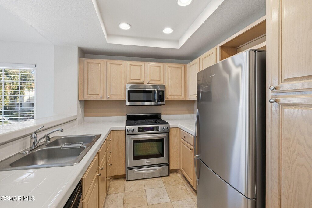 Welcome to this beautifully maintained condo in the gated Steeplechase community. This desirable end unit features no neighbors above or below, creating a quiet and private living experience.Enjoy the ease of a direct-access garage, indoor laundry with washer and dryer included, and a well-appointed kitchen with stainless steel appliances that opens seamlessly to the dining and family areas, perfect for everyday living and entertaining.Vaulted ceilings fill the home with natural light, while the private deck with mountain views provides a peaceful outdoor retreat. A decorative, cozy fireplace adds warmth and charm to the main living space.Resort-style amenities are just steps away, including the community pool, spa, gym, sauna, clubhouse, and park. Water, trash, and additional parking are included for added value and ease. Ideally located with easy access to the 101 freeway, fine dining, shopping, like Erewhon, and the beautiful beaches of Malibu, offering the best of convenience and coastal lifestyle.