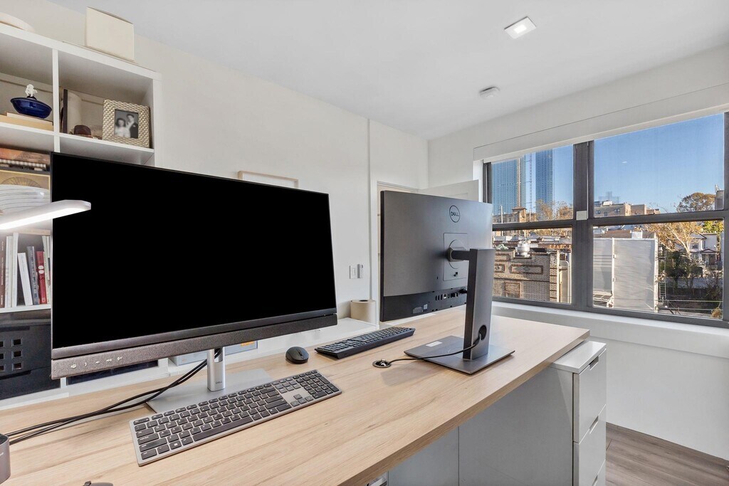 Convenience, outdoor space, and location come together in this well-laid-out 2-bedroom, 1-bath condo on the 6th floor of an elevator building in Journal Square. The kitchen features a dishwasher, electric range, microwave, and refrigerator, with a large open pass-through to the dining and living area—great for everyday living and entertaining. A spiral staircase leads to your private 300 sq ft roof deck, creating an ideal extension of your living space for relaxing, hosting, or unwinding outdoors. The building offers a common laundry room on the same floor and a shared gym/fitness room for added convenience. A dedicated parking space in a secured lot is available for $170/mo. The Journal Square PATH train is just a short distance away, providing easy access to NYC, Harrison, and Newark. A rare combination of comfort, convenience, and lifestyle.