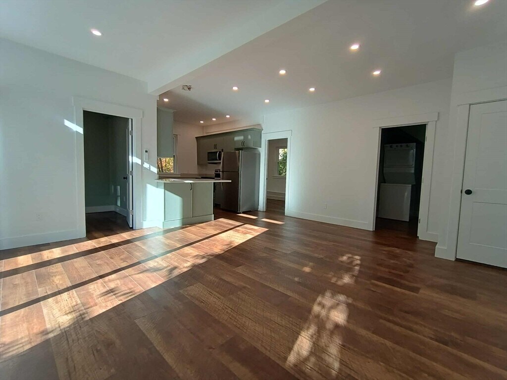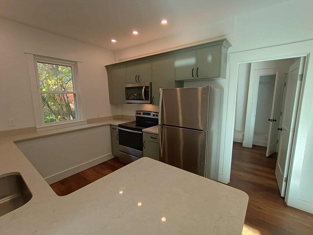 Here is your opportunity to live in a house of historic charm and modern comfort in this 2 Bed 1 Bath single family home all on one single level. This property is currently empty and available for move in now. This 200-year-old barn was gutted and renovated in 2024 into an apartment offering a retreat for those seeking tranquility and character. Open-concept layout seamlessly integrates the living, dining, and kitchen areas. The kitchen consists of brand-new cabinets, quartz counters and stainless-steel appliances (electric stove, dishwasher, built in microwave). This house consists of 2 bedrooms, one of the bedrooms is smaller and may be better served as an office space. The updated bathroom includes the washer/dryer for ultimate convenience. Plenty of space for storage in the attic is also available for use. This property includes a private driveway and a new stone patio. Tenants to pay for electric and gas. Heat pump and recessed lighting make this property highly efficient.