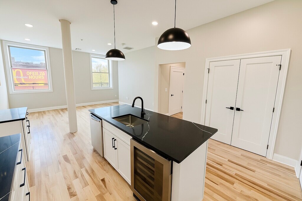 Experience refined city living in this fully renovated one-bedroom apartment at 434 Lackawanna Ave.This thoughtfully designed space features real hickory hardwood floors and a spacious open-concept layout that combines modern finishes with comfort.The kitchen offers white cabinetry with black hardware, black quartz countertops, and a sleek center island equipped with a sink, dishwasher, and built-in wine cooler—perfect for entertaining or everyday living.The bedroom provides a private, serene retreat enclosed by walls for added quiet and separation, while still maintaining an airy, open flow to the rest of the apartment. The bathroom showcases polished gray porcelain tile throughout, a walk-in glass shower, and contemporary lighting that complements the apartment’s clean, modern aesthetic.Enjoy in-unit laundry, central air conditioning, keypad entry, stainless steel appliances, and fiber-ready internet.All utilities are included—offering a seamless living experience in a beautifully finished apartment designed for comfort, convenience, and style in the heart of downtown Scranton.
