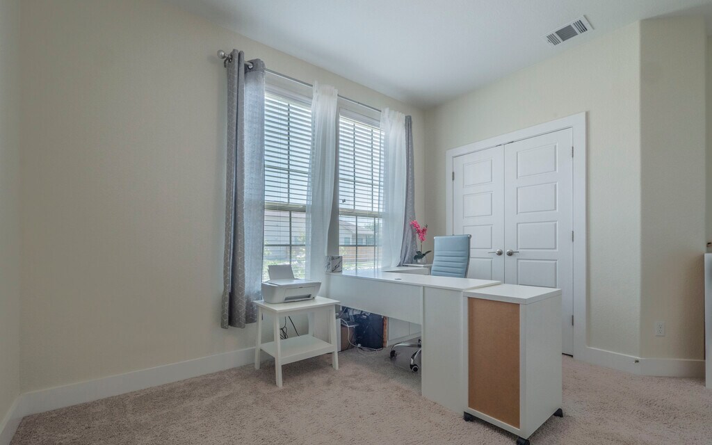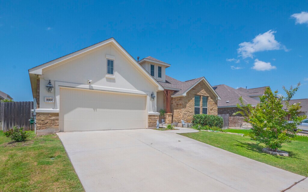 Welcome to your new home in the desirable Blackhawk community of Pflugerville, TX! This stunning 4-bedroom, 3-full-bath residence offers the perfect blend of modern luxury and comfortable living. Step inside and be captivated by the open-concept layout, featuring spectacular tile flooring that flows throughout the main living areas. The gourmet kitchen is a chef's dream, boasting elegant white cabinetry, sleek quartz countertops, and a magnificent center island—perfect for meal prep and casual dining. With high ceilings that create an airy and spacious feel, the home includes a dedicated office, providing the ideal space for remote work or study. The bedrooms are plushly carpeted, offering a cozy retreat at the end of the day. Outside, you'll find a beautiful covered patio, a wonderful spot to relax, entertain, or enjoy a family BBQ. As a resident of the Blackhawk community, you'll have access to fantastic amenities, including a community pool, a beautiful amenity center, and scenic trails—all designed for your entertainment and enjoyment. 3 Car Garage.