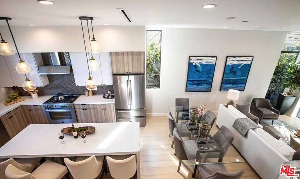 Located in the Studio City area, this approximately four-story, modern coastalinspired residence offers four bedrooms and four and one-half bathrooms with a thoughtfully designed, open layout. Each bedroom includes an ensuite bath featuring designer tile, contemporary vanities, statement lighting, and oversized mirrors, while a convenient half bath is located on the main living level. Interior features include European oak flooring, approximately 10-foot ceilings, smart home technology, and abundant natural light throughout. The kitchen is equipped with Italian-imported Bertazzoni appliances, including a 36-inch gas range, a large center island, and seamless integration with the living and dining areas. A fourth-level deck provides elevated outdoor space with expansive views. Corner positioning enhances light and privacy, and the surrounding neighborhood offers close proximity to dining, shopping, and local amenities. Tenant pays gas and electricity. Home is offered unfurnished; furnishings may be available for an additional monthly cost and deposit. One small to medium dog permitted with additional deposit. Smoking is not permitted. All features, measurements, and availability are approximate; tenant to independently verify all information. MLS# 25630789