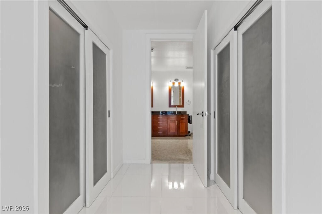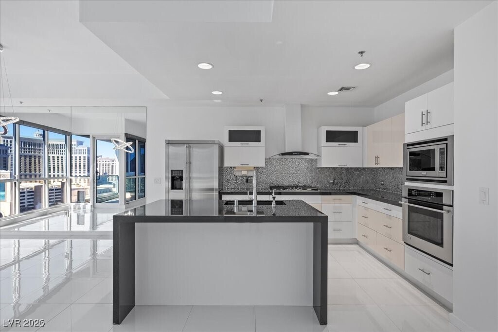 Indulge in sophisticated high-rise living in Panorama Towers. This beautifully remodeled two-bedroom residence features dramatic floor-to-ceiling windows that perfectly frame breathtaking views of the Las Vegas Strip. Step out onto your private balcony to experience the vibrant city lights and iconic desert sunsets firsthand. The interior is a masterpiece of modern design, highlighted by a show-stopping kitchen with a quartz waterfall island, custom upgraded cabinetry, and premium stainless steel appliances. Designed for ultimate comfort, the layout includes two oversized primary suites, each serving as a spa-inspired retreat with dual vanities, deep soaking tubs, and separate showers. Residents enjoy amenities including a 24-hour concierge, limo service, a resort-style pool, fitness center, and guard-gated security. Located just moments from Allegiant Stadium, T-Mobile Arena, and the city's finest dining and entertainment, this residence puts you at the heart of the action.