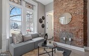 Nestled in the heart of Mount Vernon, this charming 1-bedroom, 1-bath condo offers a rare opportunity to live in a beautifully preserved Victorian building (completely renovated in 2022!) with modern updates throughout. The striking red brick exterior, complete with classic turret detailing, sets the tone for the character found inside. The interior features a thoughtfully updated kitchen with stainless steel appliances, crisp white shaker cabinets, designer tile backsplash, and under-cabinet lighting. High ceilings and oversized windows fill the open living space with natural light, creating an inviting and airy atmosphere. The bedroom is both elegant and unique, featuring a curved bay window with stained glass details and refined period trim. The bathroom is sleek and contemporary, showcasing a glass-enclosed walk-in shower, marble-inspired tile, and a floating vanity. Located in a pet-friendly boutique community just steps from shops, dining, and cultural landmarks, this residence blends timeless architecture with the convenience of downtown living.