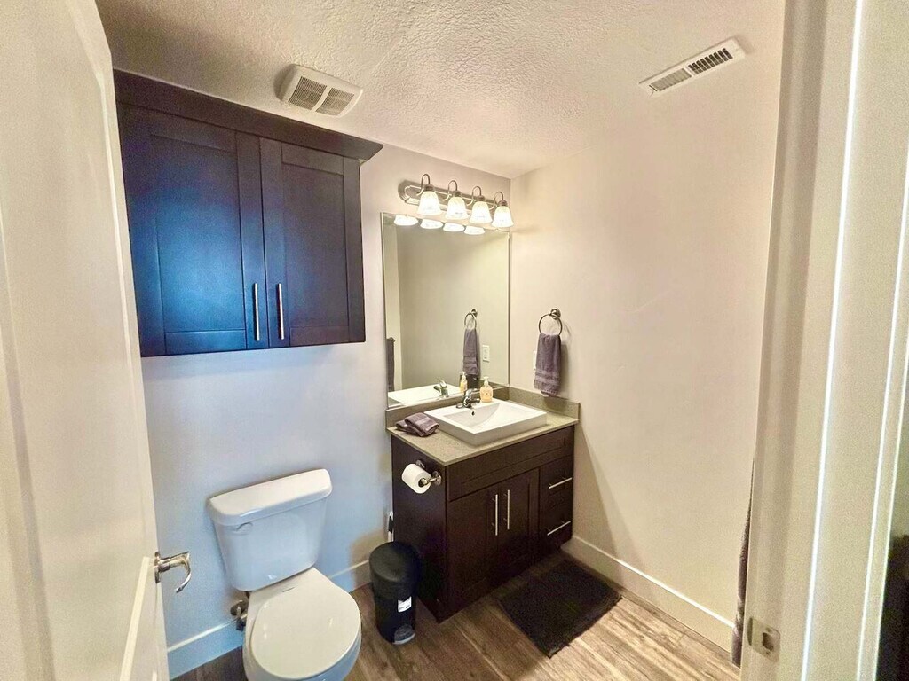 Feel at home in this Vélo Cityside condo, offering a perfect balance of luxury, affordability, and chic urban living in a safe and walkable area of downtown Salt Lake City. This condo is furnished with upscale furniture and décor. The bed features an ultra-comfortable memory gel mattress, and a variety of pillows are provided. The living room has a large TV, and the bedroom has a small TV, both with several streaming services ready for you to log into. The sofa in the living room is a pull-out queen bed with an upgraded deluxe mattress. Free parking is available in a secure indoor garage. A second parking spot can be reserved upon availability. One travel crib (pack n' play), one baby high-chair, one self-inflating deluxe twin bed kit, and one baby stroller are available free of charge on request. Additional cribs, high-chairs, or beds can be provided for $25 per item per stay. Modern amenities include a rooftop patio with an oversized hot tub, fireplace, and comfortable lounge chairs with views of the Rocky Mountains, an indoor movie theater, and a large 24-hour fitness center. Centrally located near Salt Lake's famous Library Square, this condo is close to interesting cafes, restaurants, and attractions. A trolley stop about a block from the condo can take you to any of the attractions in Salt Lake City within a few minutes. This condo is located in a very safe and walkable neighborhood. Dogs are welcome, but cats are not allowed. Any other type of animal needs to be approved ahead of time. [SI]