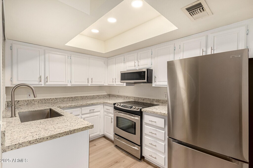 Awesome little place to reside! Newer style fixtures,newer appliances. Quartz countertop in kitchen,Washer & Dryer Stack units inside. Extra storage off of bedroom. Great views and a ton of amenities! This Mesa gem is a must see!