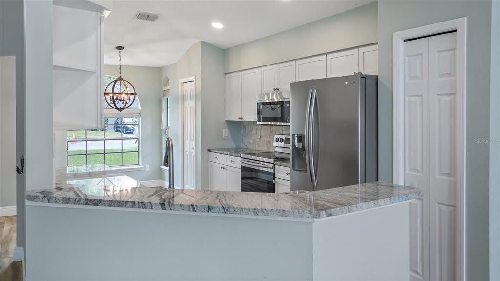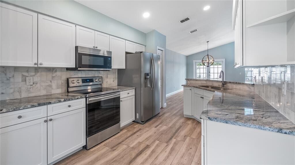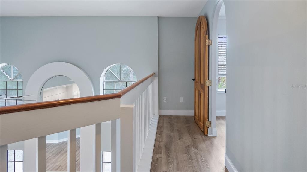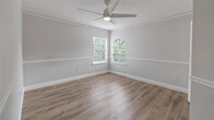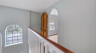 Come one and and all to this fantastic home. The first thing you will notice is the fresh exterior paint. New paint really POPS. You don't have to worry about your guests getting wet with the spacious front entry. This home is just over 1800 sq ft, it has 4 bedrooms and 2.5 bathroom. The master bedroom is located downstairs! As you enter the home the foyer gives you lots of options. You can head to the garage, kitchen, living area, upstairs, or the half bath. If you take a left from the foyer you enter the kitchen which has a new facelift with white shaker cabinet faces, stainless steel appliances, marble counter tops, tile backsplash and ceramic tile. The kitchen has an eat-in breakfast space will large windows as well and being open to the dinning and living rooms. You won't miss out on any of the action as you check on the meal or finish up a few dishes. The living and dining room combo adds to the openness of the space which is amplified by the soaring ceilings and brick fireplace. Rounding out the ground floor is the master suite. The ensuite bath is very large. It has a separate garden tub and stand up shower enclosure. If you have a hard time sharing bathroom space there is no need to worry, the double vanity is enormous and even has a place to sit to put on your final beautifying touches before you head out. The "thrown" is also behind closed doors. You can also access the large closet in the bath. (don't forget there is "secret bonus storage" around the corner in the closet) Head back through the living room to the foyer and head upstairs. The fourth bedroom has an amazing wood arched door that really brings a higher level of class to the space. All the three upstairs bedrooms features built in closets and are ample in size. The secondary bath has a nice window bringing natural light into the space while still providing privacy. The back yard is made for grilling and low maintenance with a large patio and planters with palm trees. The yard won't take much to maintain. The community is super close to the local public schools and you have options on how to get to Lake Mary Blvd with its shopping and dinning experiences. Come on over today and take a look. We look forward to hearing from you.
