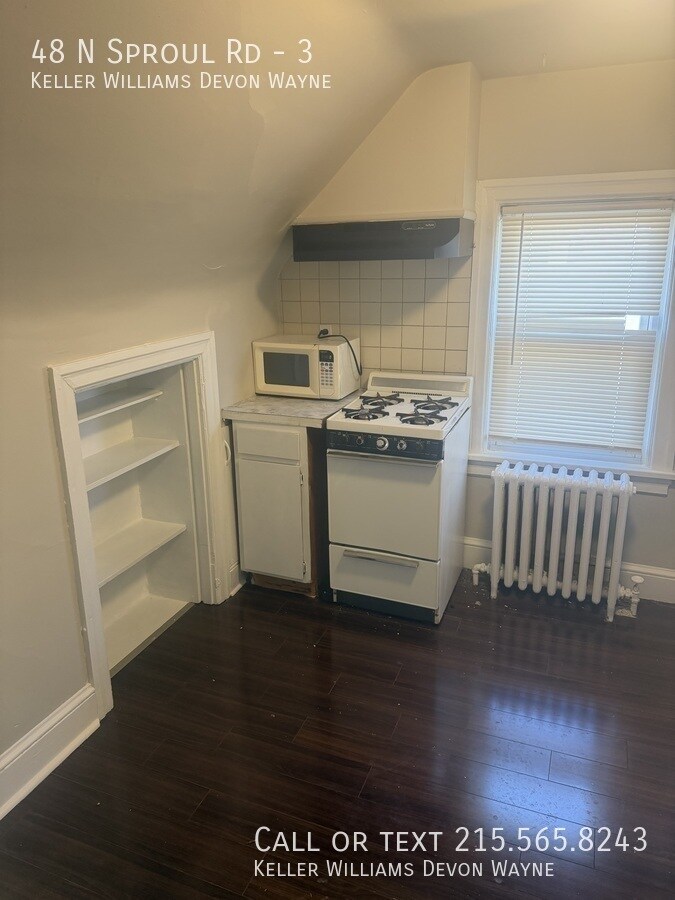 Welcome to 48 N Sproul Rd in Broomall! Upon arrival to the property, you are greeted by a wonderful outdoor space, a shared driveway for parking and a gorgeous wrap around porch! On the third floor you will find a charming one bedroom one bathroom unit. Enter into a spacious living area, with plenty of natural light. To the right of the unit you have the full bathroom, with a large closet space for storage of all your bathroom needs. Past the bathroom is the kitchen which is complete with an efficiency size stove top/oven as well as a fridge and microwave. On the left of the unit you have the bedroom, which also has a large closet as well as a crawl space for storage. Tenant pays gas & electric, water is included in the rent. Available immediately! Apply today!