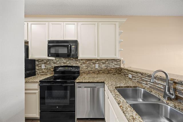 Second floor condo featuring white appliances, fireplace. open kitchen, stacked washer,dryer, walk in closet, and private tree shaded balcony. This gated community offers large pool and clubhouse and is close to shopping and tollway.