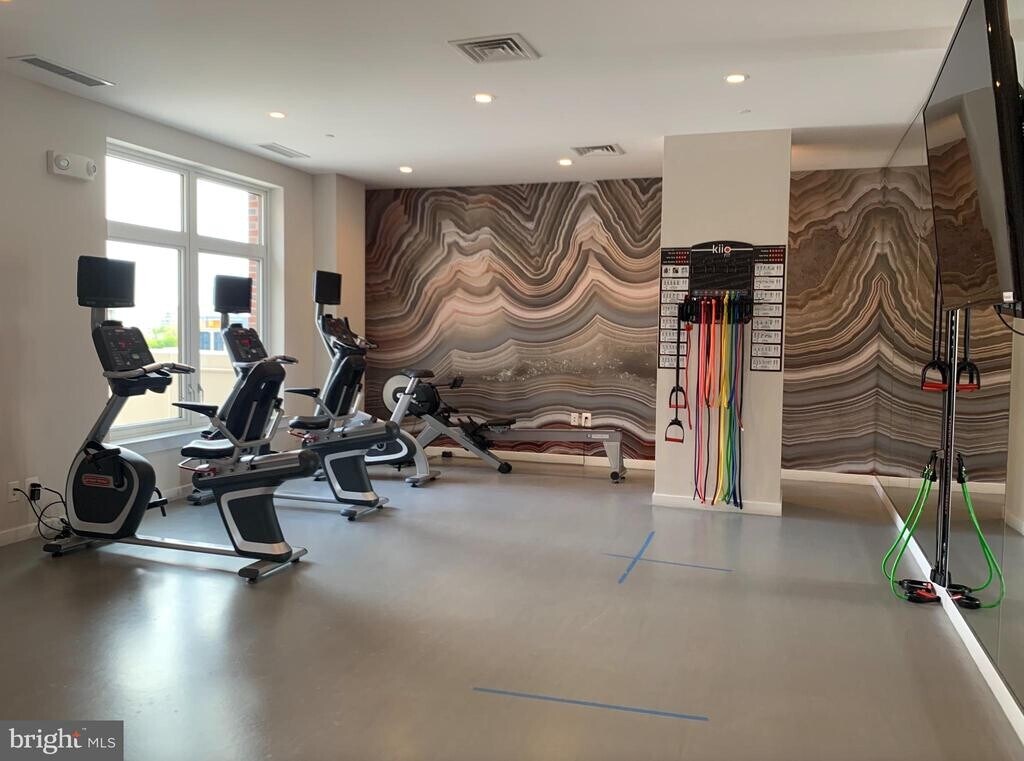 Bethesda Row condo in an exclusive and sophisticated 55 unit luxury, mid-rise building built in 2017. The building offers 24/7 Concierge, two rooftop terraces with plenty of seating overlooking Bethesda (one with grills and a fireplace), a gym/fitness center, a lounge/party room, a bike room, and additional storage. Residents can take advantage of restaurants, shopping, and being a few blocks from Metro (walk score is 99/100). This one bedroom, one full bath unit has been thoughtfully designed. The kitchen has top of the line Bosch stainless steel appliances with a 5 burner gas range and tile backsplash, quartz countertops, and a large center island open to the living area. The bedroom is spacious with wonderful closet space. The large bathroom has marble floors, a large double vanity, and a glass enclosed shower with a rain showerhead. Stackable high efficiency washer and dryer in unit. One assigned, garage parking spot for only $150/mo. No pets and no smoking. Electricity is not included.