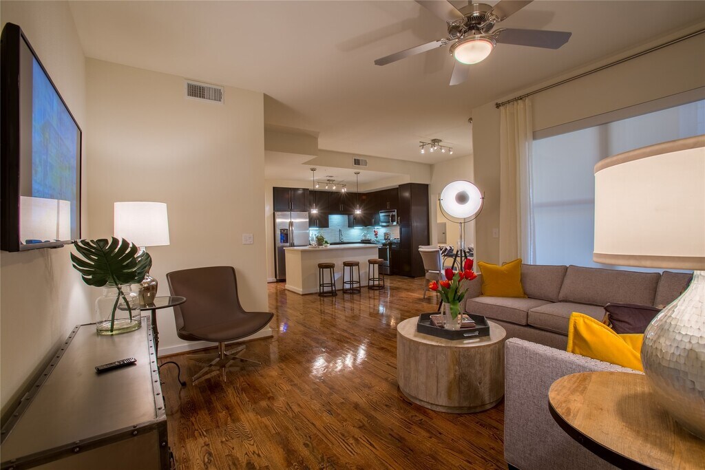 B1 plan with 2 bedrooms,2 bathrooms in a luxurious mid-rise property in the heart of Downtown positioned next to Daikin Park. This is a spacious open plan featuring oak hardwood flooring,solar shades,a gourmet island kitchen with stainless steel appliances,gas range,built-in wine chiller,quartz & granite counters,a balcony off the living room & large built-in computer desk. The bedrooms features low pile designer carpet,spacious walk-in closet & can accommodate a king size bed + side tables. The primary bathroom has a frameless walk-in shower,vanity sinks,granite counters & large garden style tub. This impressive community includes a lounge pool,a heated lap pool,outdoor kitchens,state-of-the-art fitness center,business center,resident lounge,morning room & coffee bar,sports lounge & deck area. Conveniently located next to Daikin Park and Discovery Green with Potente & Osso Kristalla restaurants in the building. Pricing & availability subject to change daily MLS# 45050475
