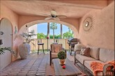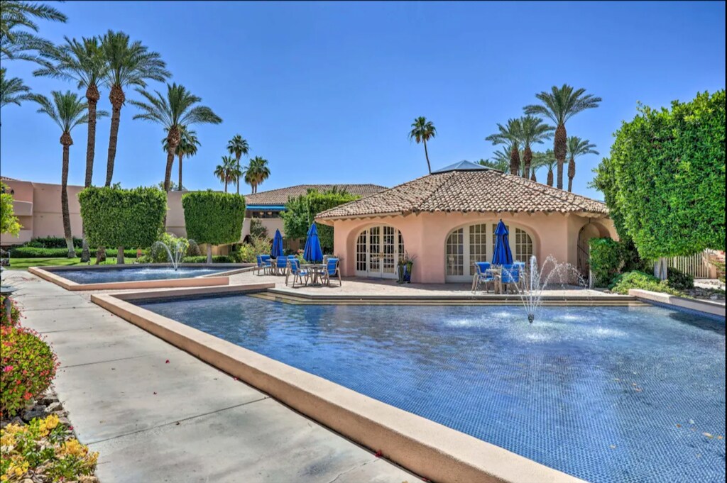 Come immerse yourself in private, very tranquil and refreshing community of Deauville French country manor resort next to the fine dining and all the fun activities of downtown Palm Springs. Or cross the street to Agua Caliente Casino and Convention center with street fair. This delightful and charming ground floor condo by the pool has the spectacular panoramic views of beautiful landscape through quaint arched private patio. Futures many amenities including: 3 pools/3 spas, clubhouse overlooking fountains, vending machine next to the icemaker, tennis courts, gym and washer/dryer in the unit. Secured parking space both underground and above. It is fully furnished. NO GRILL