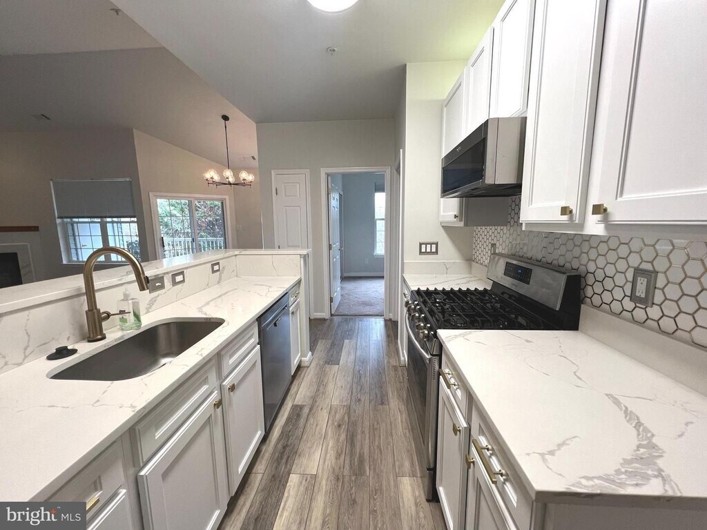 Experience luxury living in this stunning penthouse condo nestled within the coveted New Town community. This meticulously updated residence boasts an airy open-concept layout accentuated by vaulted ceilings. Offering 2 bedrooms, 2 full baths, and a versatile office/den adorned with French doors, this condo presents an ideal blend of comfort and functionality. Step into the sleek, modern kitchen adorned with exquisite quartz countertops, stainless steel appliances, a pantry, gas cooking facilities, and an inviting eat-in area complemented by a charming bay window and luxury vinyl flooring. The spacious living room is enhanced by a cozy gas fireplace, perfect for warming up during chilly winter evenings, and seamlessly connects to the kitchen/dining area, facilitating effortless entertaining. Retreat to the sumptuous master suite featuring a stylish wood-trimmed accent wall, custom his-and-her closet designs, and an opulent private bathroom equipped with dual sinks, a jetted soaking tub, and a generously sized shower. The second bedroom provides convenient access to a full bathroom located in the hallway. Relish in the tranquility of your own private balcony overlooking lush trees, offering a serene outdoor escape. As a resident, you'll enjoy access to a plethora of community amenities, including pools, playgrounds, a dog park, tennis courts, and scenic walking paths along the Red Run Stream Valley Trail. Conveniently situated near Wegmans, the Metro, major commuter routes, highways, schools, and an array of shopping and dining options, this condo offers the epitome of modern convenience and upscale living. Home and carpet to be professionally cleaned.