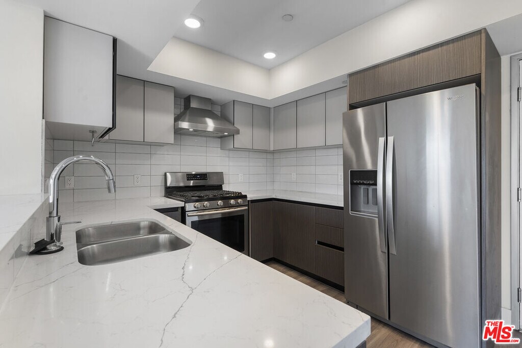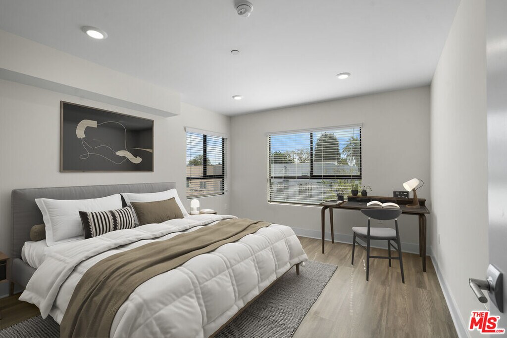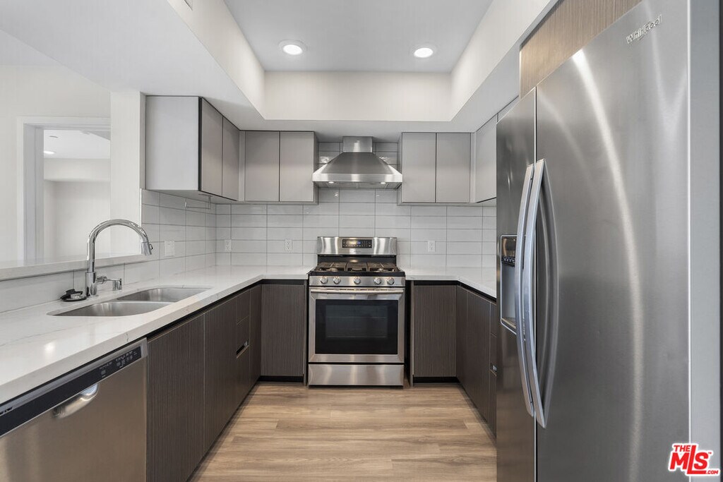 Corner penthouse unit! Top floor unit featuring 2 bedroom and 2 full bathrooms. Spacious floorplan with separated bedrooms great for roommates or for having both a primary bedroom and guest bedroom/office. Modern concept kitchen features stainless steel appliances, Caesarstone countertop and glass tile backsplashes. Recessed lighting, beautiful flooring, and a walk-in closet. Washer/dryer in unit. Two tandem parking spaces in a secure gated garage. Small pets allowed. Centrally located and convenient to Robert Burns Park, Larchmont Village, Hollywood, and Koreatown. Some photos are virtually staged. MLS# 25609357