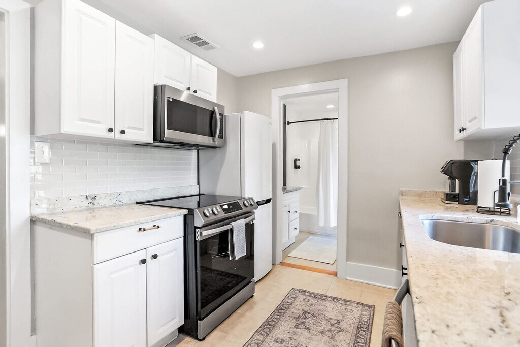 Step into the perfect blend of Savannah charm and modern comfort in this quaint and cozy, fully furnished (utilities included) second-floor Parlor apartment. With its shabby chic style and calming atmosphere, this space instantly puts you at ease the moment you walk through the door. Originally built in 1886, the Parlor retains its historic character while offering thoughtful modern updates. Enter through your private entrance and relax in the spacious living area, complete with a plush sofa and a convenient workspace. The bedroom features soaring ceilings, a queen memory foam bed with luxury linens, a flat-screen TV, and ample closet space for your belongings. The bathroom combines vintage elegance with modern touches, featuring a tub/shower combo and designer details. Whip up something special in the gourmet kitchen, equipped with granite countertops and everything you need to prepare a meal—or just your morning coffee. Enjoy an evening cocktail on your private balcony, or head down your balcony stairs to the shared courtyard below. For added convenience, there's metered parking directly in front of the property. You can easily manage parking through the ParkSavannah app or contact the City of Savannah for daily parking passes. Please note: This unit is part of a multi-unit complex. You'll access the Parlor via the exterior staircase and enter through the front door where you will enter the second floor residence. The back courtyard can be accessed through the kitchen's back door. Utilities included, 30 day minimum rental, no pets, no smoking Savannah's 1886 gem where history meets modern comfort. Just steps from the city's squares, shops, and dining. Perfect for couples or individuals seeking a relaxing, peaceful retreat. Fully furnished, utilities included, 30 day minimum, not pets, no smoking