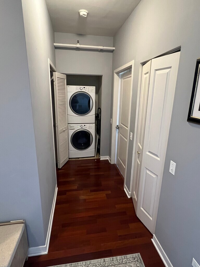 Bright and sunny corner unit available at Parkside of Old Town with split 2 Bedroom 2 bath floor plan and wrap around deck. This unit has been fully renovated throughout! Floor to ceiling windows and 9+' ceilings make this home feel so spacious! Well appointed quartz/stainless steel kitchen with breakfast bar that opens to living room and dining area. Hardwood floors throughout and a neutral decor compliment the home. The main bedroom easily accommodates a king sized. Double vanity in main bathroom. 2nd bedroom is east facing with the bathroom just outside the door. In-unit washer/dryer. The condo includes a storage unit. So conveniently located close to Target, Jewel, Starbucks and all the Clybourn Corridor has to offer in terms of retail and restaurants. Exercise Room Shared between 511 Division and 437 Division Room is located in 437 Division. The building also offers a secured receiving and mail room, and dedicated bicycle storage. Parking space included.