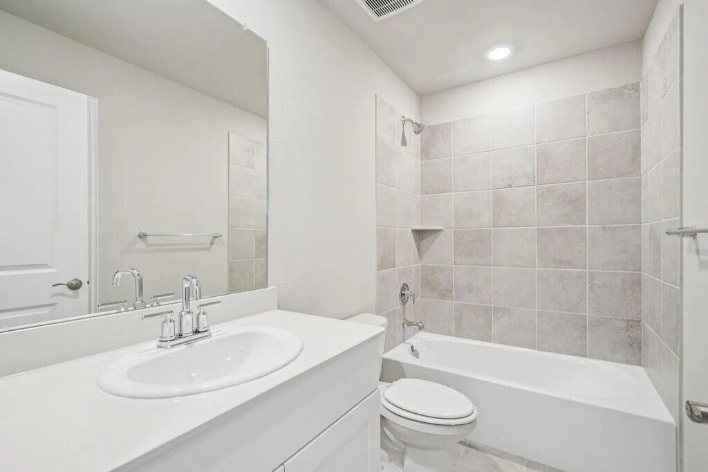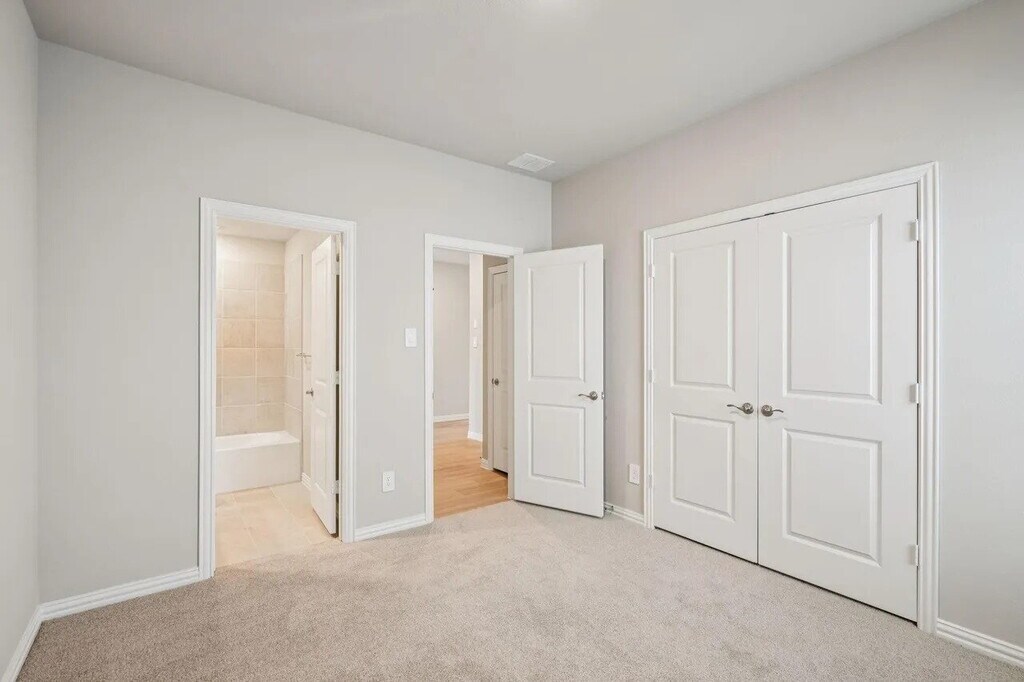 This is a brand-new, energy-efficient single-family home in the Simpson Crossing community, designed for modern living and comfort. It features a spacious open layout with seamless indoor-outdoor flow to a covered back patio. The kitchen includes white cabinetry and veined white quartz countertops, while the floors feature tan-tone EVP flooring and complementary carpet in private areas. The community amenities include greenbelt trails, a playground, and a resort-style pool, perfect for families and active lifestyles.