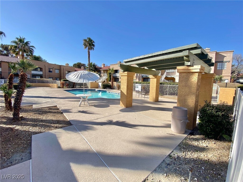 THIS CONDOMINIUM IN A GATED COMMUNITY WITH 2 BEDROOMS AND 2 FULL BATHS. THE OPEN LIVING AND DINING AREA FEATURES TILE FLOORING, A CEILING FAN, AND SLIDING GLASS DOORS TO A PRIVATE BALCONY. THE KITCHEN BOASTS GRANITE COUNTERTOPS, A BREAKFAST BAR, AMPLE CABINETRY, AND A FULL APPLIANCE PACKAGE. THE PRIMARY BEDROOM INCLUDES A WALK-IN CLOSET AND EN-SUITE BATH WITH DUAL VANITIES, WHILE THE SECOND BEDROOM SHARES THE HALL BATH AND OFFERS GENEROUS CLOSET SPACE. RESIDENTS ENJOY AMENITIES INCLUDING A CLUBHOUSE, FITNESS CENTER, POOL, SPA, PLAYGROUND, AND BARBECUE AREA. ASSIGNED COVERED PARKING AND ON-SITE LAUNDRY ADD CONVENIENCE. IDEALLY LOCATED NEAR HELEN JYDSTRUP ELEMENTARY, GRANT SAWYER MIDDLE, AND DURANGO HIGH, WITH QUICK ACCESS TO SHOPPING, DINING, AND THE I-215 BELTWAY.