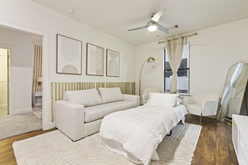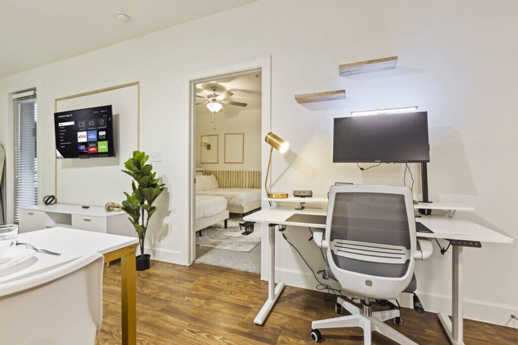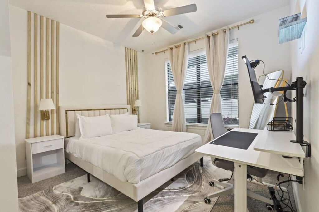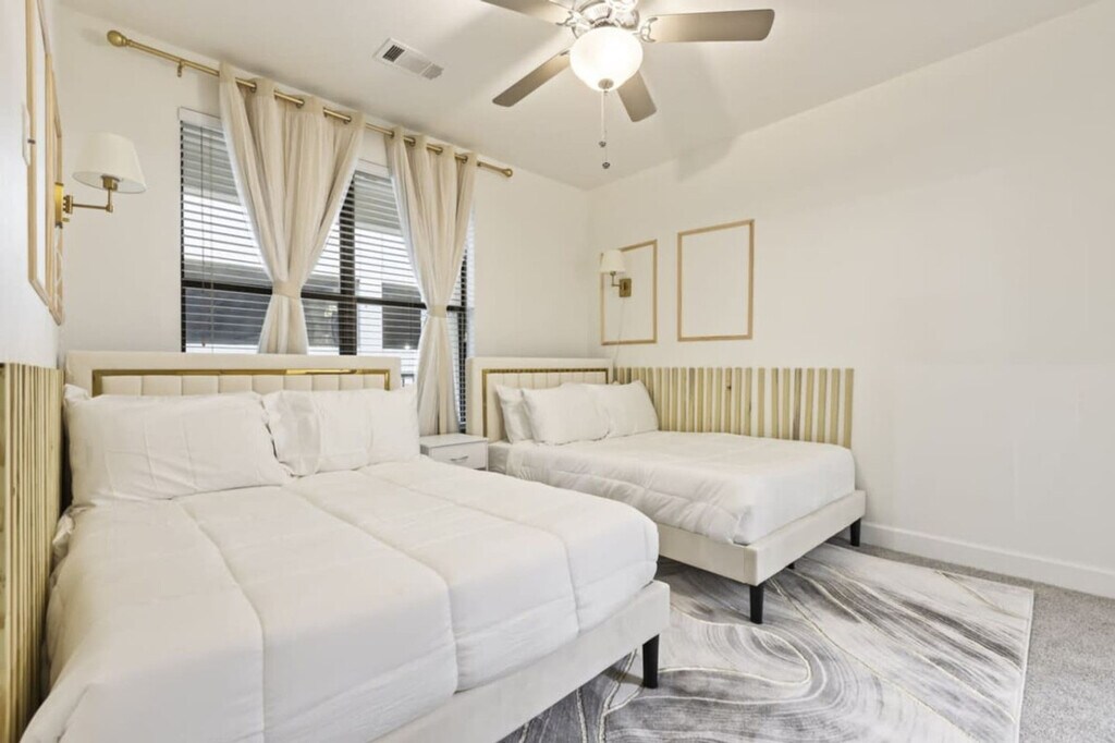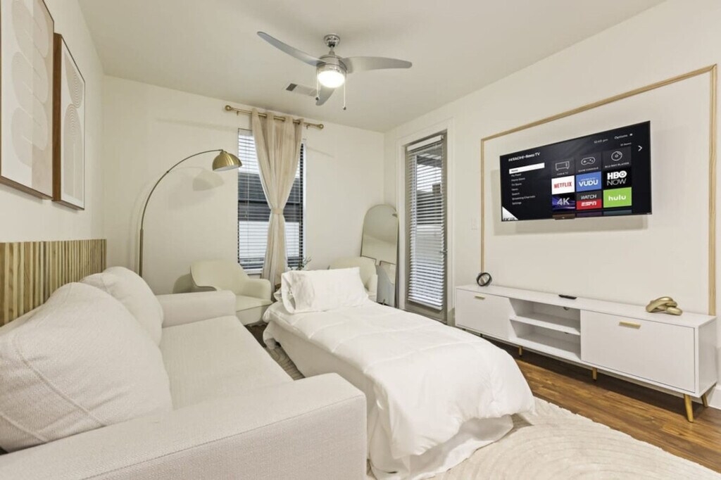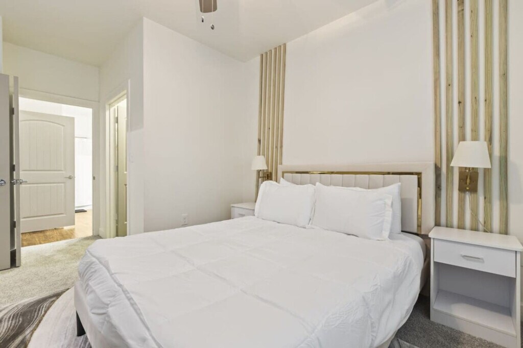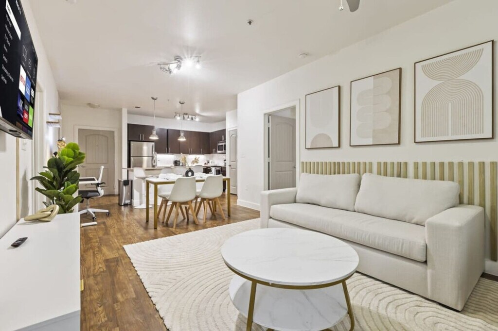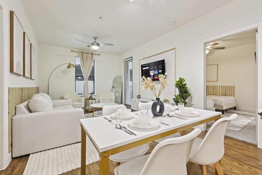 Feel at home in this recently renovated 2-bedroom, 2-bath apartment in Frisco, TX. This apartment provides a dynamic living experience just moments away from The Star, Toyota HQ, and JP Morgan Chase. This newly remodeled apartment features luxurious furnishings and elegant decor, including granite countertops, a kitchen island, and stainless steel appliances. The fully equipped kitchen includes complimentary coffee and tea. Enjoy amenities such as smart TVs, memory foam queen beds, and an additional sofa bed. Features include high-speed Wi-Fi, in-unit laundry, complete temperature control, a coffee maker, an electric kettle, and a microwave. Enjoy complimentary parking and gym access. An EV charger is available. Located near Legacy West, this Frisco apartment provides convenient access to an abundance of shopping, dining, and entertainment choices. Enjoy shopping at Stonebriar Centre, Legacy West, and The Shops at Legacy. Engage in activities such as golfing at Stonebriar Country Club, attending games at Dr. Pepper Ballpark, or supporting your favorite soccer team at Toyota Stadium. It's also a short 5-minute drive from major employers like Toyota, JPMorgan Chase, Ericsson, and PepsiCo. Convenient access to roads, highways, and grocery stores. A strict no-party policy is enforced. Ring cameras monitor the entrance, and noise detectors are installed inside. Any party activity will prompt police intervention and immediate eviction without refunds. Unauthorized guests at the unit or pool will incur a $100 fine per person. Smoking, drug, and vape use is not allowed inside the unit, on the balcony, or in the hallways of the building. There is a $1000 fine if discovered or reported. Strictly observe quiet hours from 10 pm to 8 am. Parties are not allowed in this property, including loud music, and there is a fee of $1000 if a party is discovered or if a neighbor complains of excessive noise. Pets must be disclosed and approved in advance. No pets over 50 lbs. There is an extra one-time fee per pet per stay: 1-2 nights: $100/pet, 3-6 nights: $150/pet, 7-29 nights: $250/pet, 30+ nights: $300/month/pet. All guests are required to sign a rental agreement before receiving check-in instructions. All early check-in can be requested a day before the arrival date and it is subject to approval. The rate is $20 per hour before check-in time. Standard check-in time from Mon-Sat is at 4:00 PM and 5:00 PM during Sundays. Late check-out is subject to approval and must be notified in advance. Standard check-out time is 10:00 AM. Late check-out at 11:00 AM costs $20.00. At 12:00 PM it costs $40.00. Any guest checking out beyond 12:00 PM is subjected to a penalty of $300.00 and immediate expulsion. If an excessive mess is discovered after your stay, you will be charged accordingly on top of the standard cleaning fee. You will be charged for stained or damaged sheets/towels. Please don’t use the face or bath towel as a kitchen towel. There will be a $10 charge if face towels are stained. If there is no paper towel, please let us know. Please be advised that we do not provide extra towels and sheets. You are most welcome to bring your own towels and sheets if you will be needing more. Please be advised that an additional cleaning request during your stay would cost $150.00. We do not allow packages/mail to be sent to the address you’re staying at. You may deliver items to the door, or to a local FedEx/UPS. We cannot help you to retrieve the delivered mail. You will be charged for any missing or damaged items. There is a $600 penalty for lost keys/clicker/fob. Do not alter any safety device. There is 1 security camera pointing at the door entrance. Blocking or disconnecting this device will lead to immediate termination of your stay with no refund. If any damage or issue arises that requires repair, we will notify you promptly. Repairs may occur without prior notice and cannot be used as a reason for a refund. $600 penalty for lost or damaged key/ fob / parking permit. $500 penalty if you’re locked out and will need us to send someone to assist you. All stays longer than 29 days must be cleaned by our housekeeping team. This service will cost $150, which must be paid for by the guest. Private entrance, backyard with BBQ grill and outdoor dining area, and a patio or balcony with sun loungers. Self-check-in and check-out. Prompt communication and support. [SI]