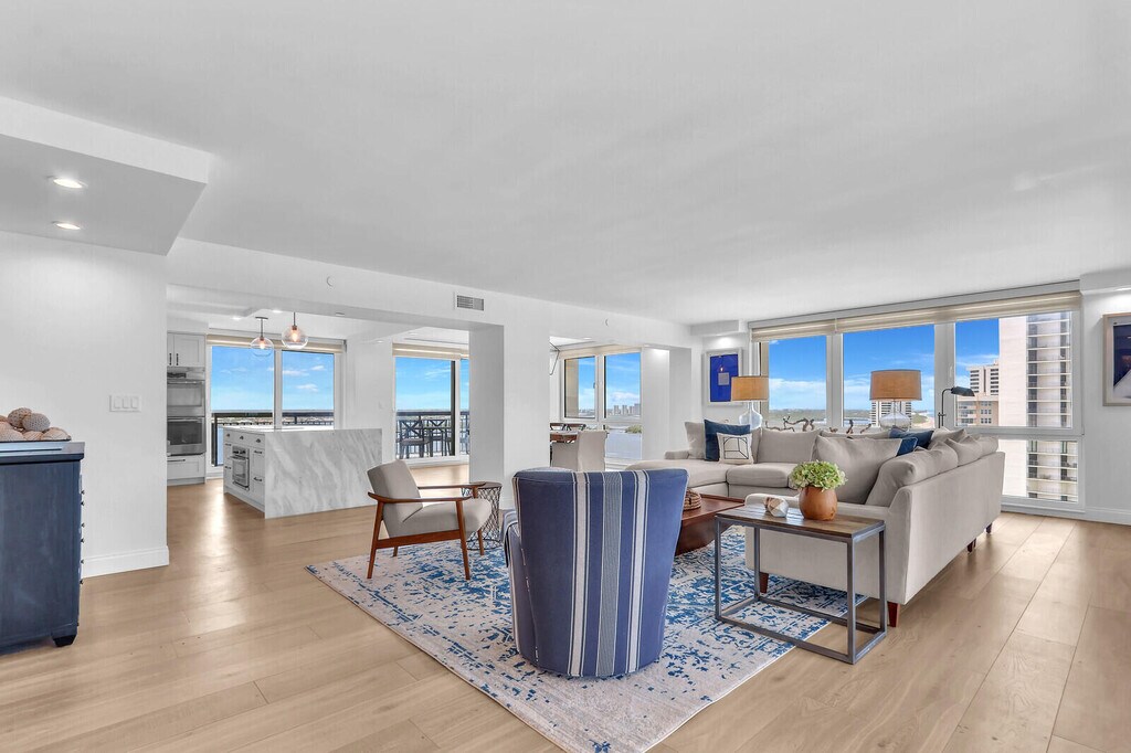 This spectacular corner ''J''-stack condo at Eastpointe II is a luxury-resort-chic condo available for a seasonal rental on Singer Island. Fully furnished and completely renovated to live like a single-family home in the sky, Unit 18J delivers over 3,000 sq ft of sun-drenched space with a dramatic wrap-around balcony boasting 300-degree views of the Atlantic, Intracoastal, and bay. Inside, designer plank-tile floors flow past a chef's marble-island kitchen into an airy great room; all three bedrooms feature en-suite baths with dual vanities and open to the balcony; LED-lit custom closets, laundry tub, and storage rooms on your floor add convenience. Eastpointe II's world-class amenities include a renovated pool and sundeck (see supplement)...