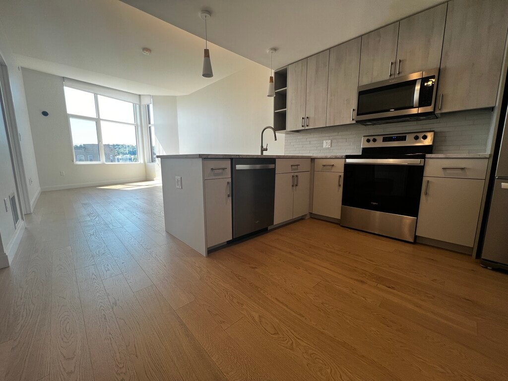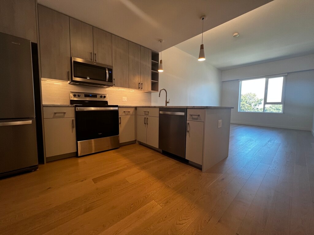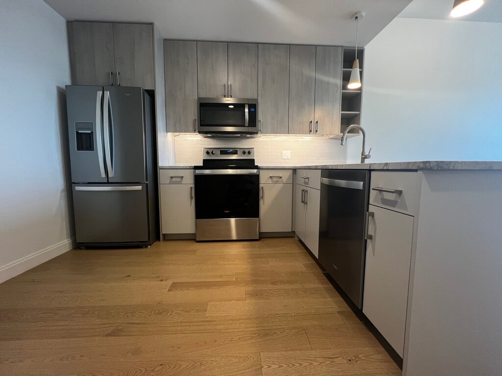 Beautiful and modern layout. This spacious apartment has lots of natural light, new appliances, wooden floors, in unit washer and dryer and so so much more. This apartment has all the things that make the residents day to day tasks simple as possible! Great place to return to after a long day or to work through the day as home office! Call today to tour!