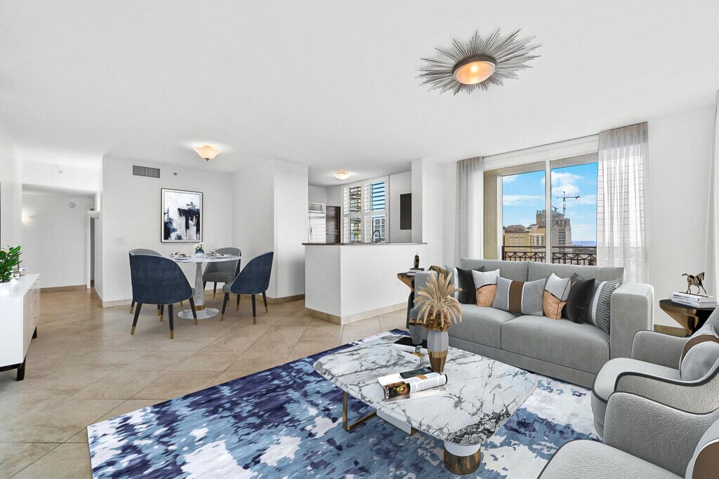 Welcome to ''The Beverly'' a fully furnished,turnkey penthouse residence inspired by the timeless elegance of the Beverly Hills Hotel,now available in the heart of downtown West Palm Beach. This impeccably renovated 2-bedroom,2-bathroom penthouse features 10-foot ceilings and a coveted south exposure,offering sweeping views of the city skyline,Intracoastal Waterway,and the Atlantic Ocean. Every detail has been thoughtfully curated,blending modern luxury with classic California glamour. The residence has been completely renovated throughout and showcases tile flooring,stainless steel appliances,and a spa-like primary bathroom with dual shower heads. Each room is adorned with Gray Malin artwork,creating a refined yet relaxed coastal aesthetic. Cable and high-speed WiFi are included,making this home truly move-in ready. Step outside and enjoy unparalleled walkability to CityPlace,Equinox,Eataly,Harry's,Adrienne's Pizza,premier professional offices,and more,placing world-class dining,fitness,and entertainment just moments from your door. Residents enjoy full-service,resort-style amenities including valet parking,front desk concierge service,a large community pool,hot tub,outdoor grilling areas,fitness center,sauna,and a newly renovated club room. Annual rentals are offered at $8,000 per month. Seasonal rates are $12,500 per month from January through May,$5,000 per month from May through November,and $8,000 per month for November and December. Experience penthouse living with effortless luxury,designer style,and unbeatable downtown convenience. Welcome home to The Beverly! MLS ID R11152613