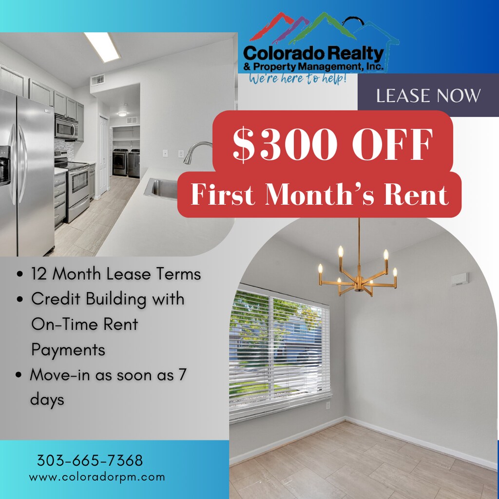 $300 OFF First Months' Rent Included in Rent: Water, Sewer, Trash, Landscaping and Snow Removal. This inviting residence offers a comfortable living room with a cozy fireplace, complemented by a mix of hardwood and carpet flooring throughout. The kitchen comes fully equipped with modern conveniences including an electric stove, refrigerator, dishwasher, microwave, disposal, and ice maker, making everyday living easy and efficient. Enjoy year-round comfort with air conditioning, gas heat, and ceiling fans, along with the convenience of an in-unit washer and dryer. Outside you can relax on your private deck, balcony, patio, or porch, perfect for enjoying Colorado’s beautiful weather. The home also includes a 1-car attached garage for secure parking and added storage. Within a mile, you can easily stroll to Olde Town Arvada, where you’ll find cozy coffee shops, local restaurants, breweries, and weekend events that give the area a friendly, small-town feel. Nearby parks and trails make it easy to get outside, whether you’re taking a morning routine or enjoying a sunny afternoon. You’re also close to everyday conveniences like grocery stores, fitness studios, and quick dining options, while light rail access and major roads make commuting into Denver or exploring the foothills simple. It’s a relaxed, welcoming neighborhood that blends convenience, community, and classic Colorado charm. We are pledged to the letter and spirit of the U.S. Policy for the Achievement of Equal Housing Opportunity throughout the Nation. We encourage and support a program in which there are no barriers to obtaining housing because of Race, Color, Religion, Sex, Handicap, Familial Status, or National Origin, and comply with all state and local fair housing laws. Things to know about this property: *No smoking. *Renter's insurance is required. *Tenant is responsible for utilities. *Maximum of two indoor pets (Breed Restrictions Apply) *(). *Monthly pet fee of $35 or 1.5% of the tenant's monthly rent, whichever amount is greater. *Refundable deposit of $300 for pet(s) *Refundable security deposit equivalent to 1x of one month’s rent *Nonrefundable lease initiation fee equivalent to 10% of one month's rent due by move-in *Other terms, fees, and conditions may apply. All information is deemed reliable but not guaranteed and is subject to change. **All Colorado Realty & Property Management residents are enrolled in the Resident Benefits Package (RBP) for $45.95/month which includes renters insurance, HVAC air filter delivery (for applicable properties), credit building to help boost your credit score with timely rent payments, $1M Identity Protection, our best-in-class resident rewards program, and much more! More details upon application.** The following criteria must be met in applying: *Equifax score of 680 or above. All scores below 680 will be declined. *Gross income must be equal to 2x the monthly rent. Applicants must provide pay-stubs covering 30 consecutive days of gross income. If self-employed, tax returns must be provided. *Income Qualification with Public Housing Benefits: Where Applicants are qualified for affordable housing vouchers or other public housing payments, the amount of that voucher/payments will be first subtracted. The following criteria must be met in applying: *Convictions for sex offenses, stalking, manufacturing and/or distributing a controlled substance, and crimes resulting in the death of another person will be cause for denial. No registered sex offenders will be approved. Other convictions in the past 5 years may be cause for denial of the application pending the nature of the offense. *No evictions or outstanding balances in the past 7 years. *Bankruptcies must be discharged for 5 years with no new past due accounts. *Applicants will be required to provide a copy of a valid photo form of identification. Credit scores, adverse credit events and lack of credit will not be considered if an applicant receives a housing subsidy as defined by § 38-12-902(1.7), C.R.S. Notice Regarding Government Assistance/Subsidies Inquiry In order to ensure that we comply with Colorado law, all applicants must disclose in writing if the receive any of the following: *Supplemental Security Income *Social Security Disability Insurance under Title II of the Federal “Social Security Act”, 42 U.S.C. Sec. 401 et seq., as amended *Cash Assistance through the Colorado Works Program Created in Part 7 of Article 2 of Title 26 *A housing subsidy whereby any or all of your rental payment would be paid by a public or private assistance, grant, or loan program. Prospective tenant has the right to provide to the landlord a portable tenant screening report, as defined in section 38-12-902 (2.5), Colorado Revised Statutes; and if the prospective tenant provides the landlord with a portable tenant screening report, the landlord is prohibited from charging the prospective tenant a rental application fee; or charging the prospective tenant a fee for the landlord to access or use the portable tenant screening report. Report must include; *Name *Contact information *Verification of employment and income *Last-known address *Rental, credit, and criminal background histories, in compliance with Colorado law Reports must meet the following criteria; *Completed within the last 30 days *Made directly available to the landlord by the consumer reporting agency or through a third-party website regularly engaged in the business of providing consumer reports, in compliance with all applicable consumer reporting laws *Provided to the landlord at no cost *A statement from the prospective tenant that there has not been any material change in the information provided in the report All applicants over the age of 18 must submit an individual rental application AND pay a non-refundable $42 application fee, unless providing a portable screening report. This fee is broken down as follows: (a) Manager’s software program charges $