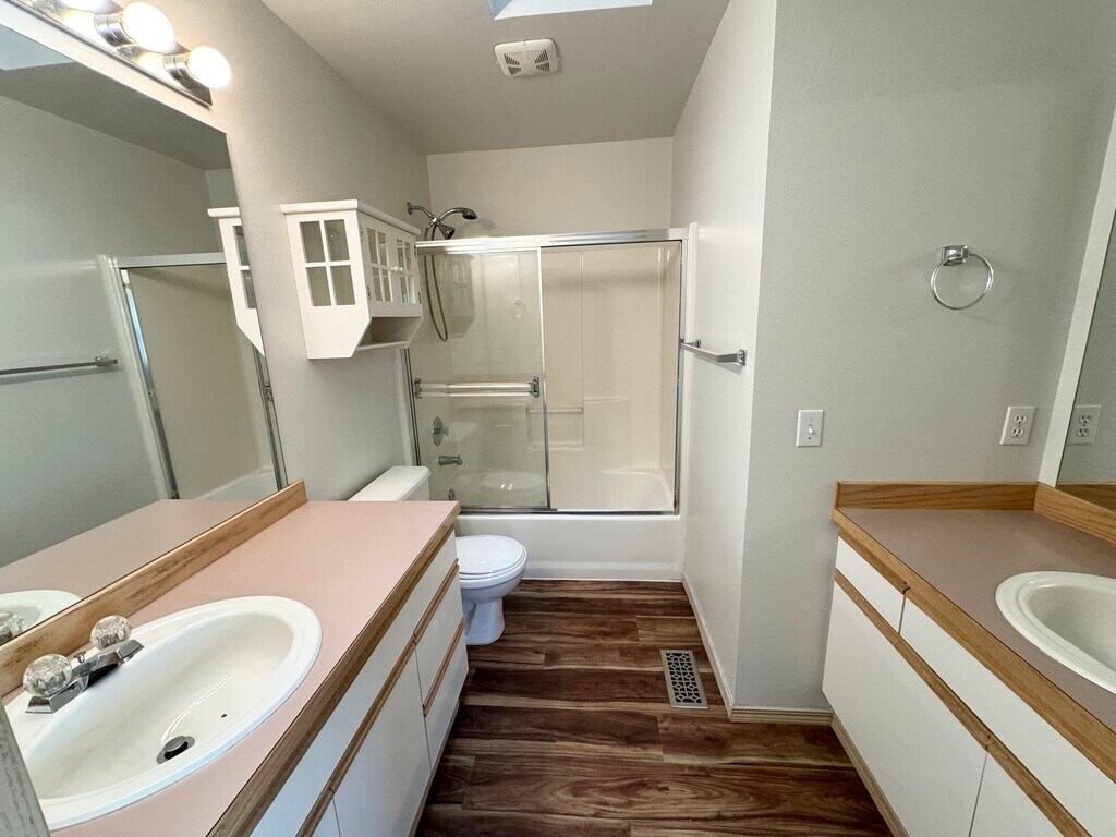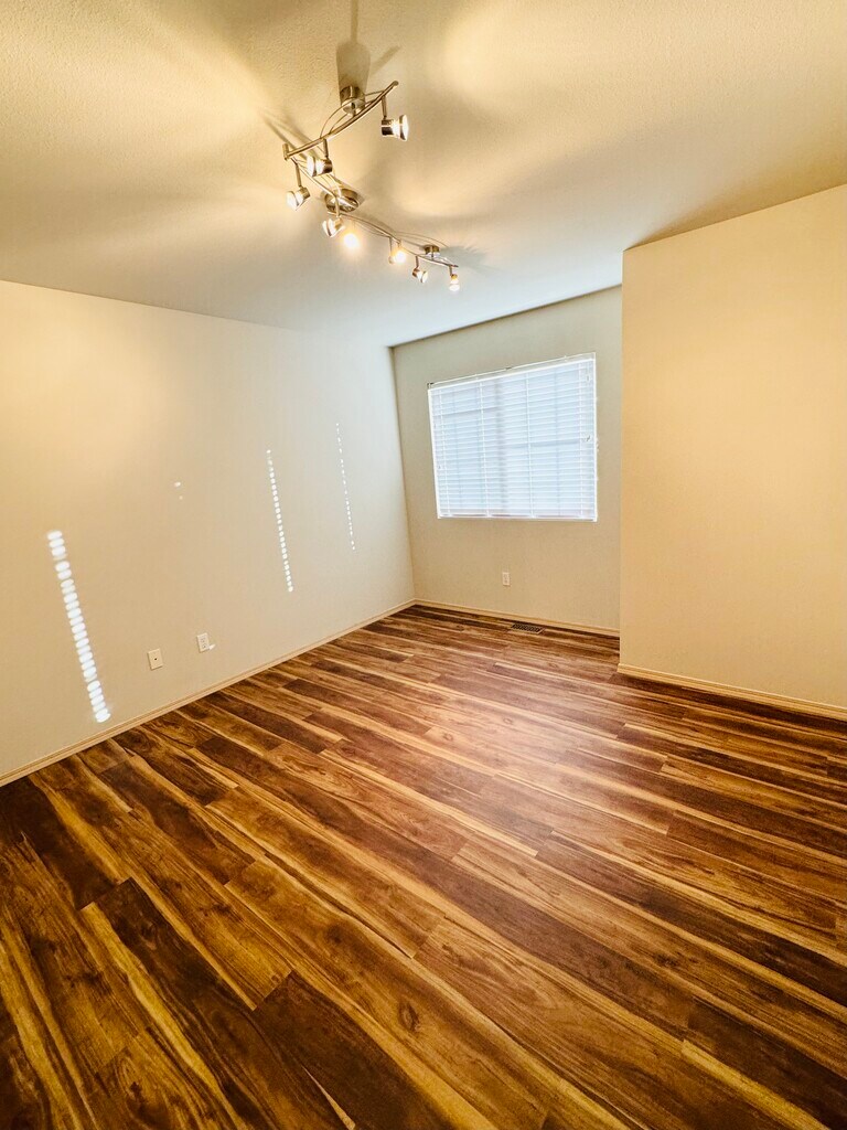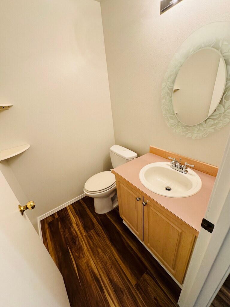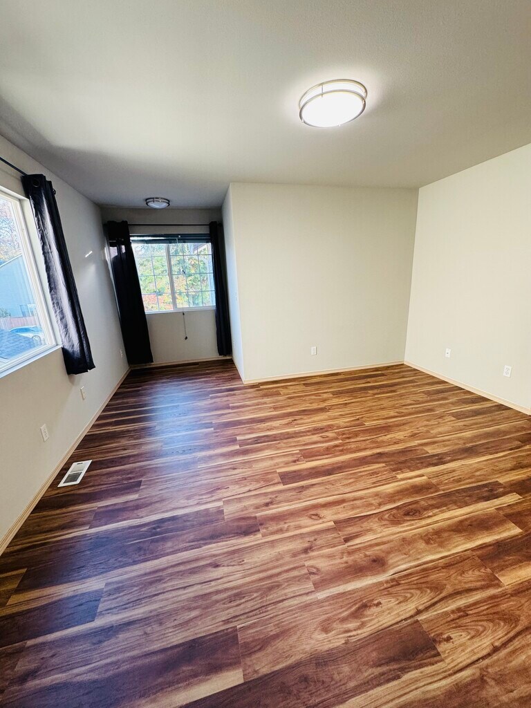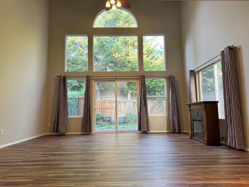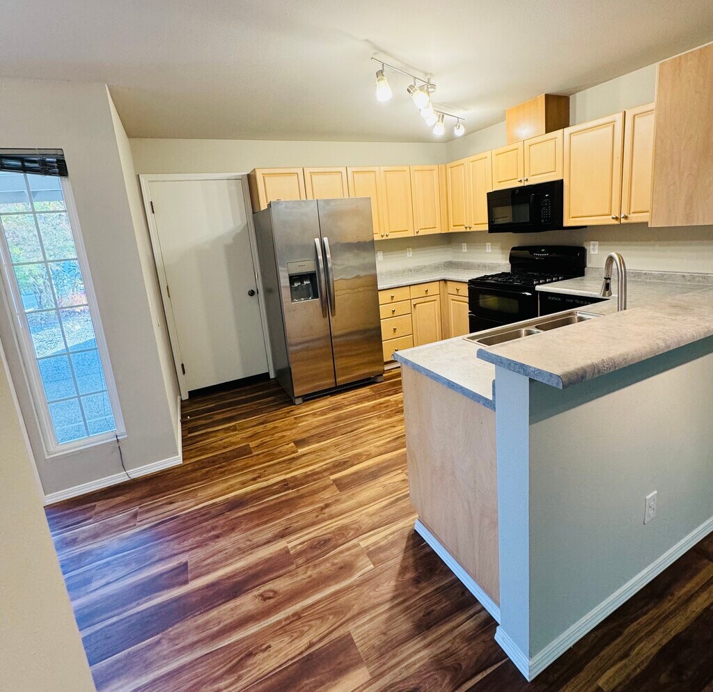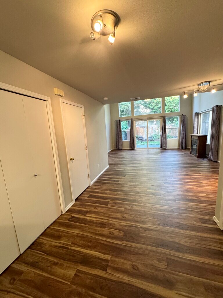 The home has a nice open layout, the kitchen is equipped with all appliances and plenty of cabinets, and it opens to the dining and living room with vaulted ceilings. The fully fenced backyard backs to trees, providing shade and privacy. Freshly painted inside with all new LVP flooring, new carpet on the stairs, and a brand-new garage door. Upstairs features two large bedrooms, each with its own full bathroom. One bedroom includes a walk-in closet. The attached garage offers plenty of storage space and a workbench. The community has its own play area and basketball court. It's within walking distance of the YMCA, Safeway, and local market, and just minutes away from the bus stop, shopping mall, and freeways. Located in a highly rated public school district with school ratings of 9, 8, and 9. LEASE TERMS Owner pays HOA fees. First and last month's rent are due at signing, along with a security deposit. No smoking allowed. Tenant pays all utilities.