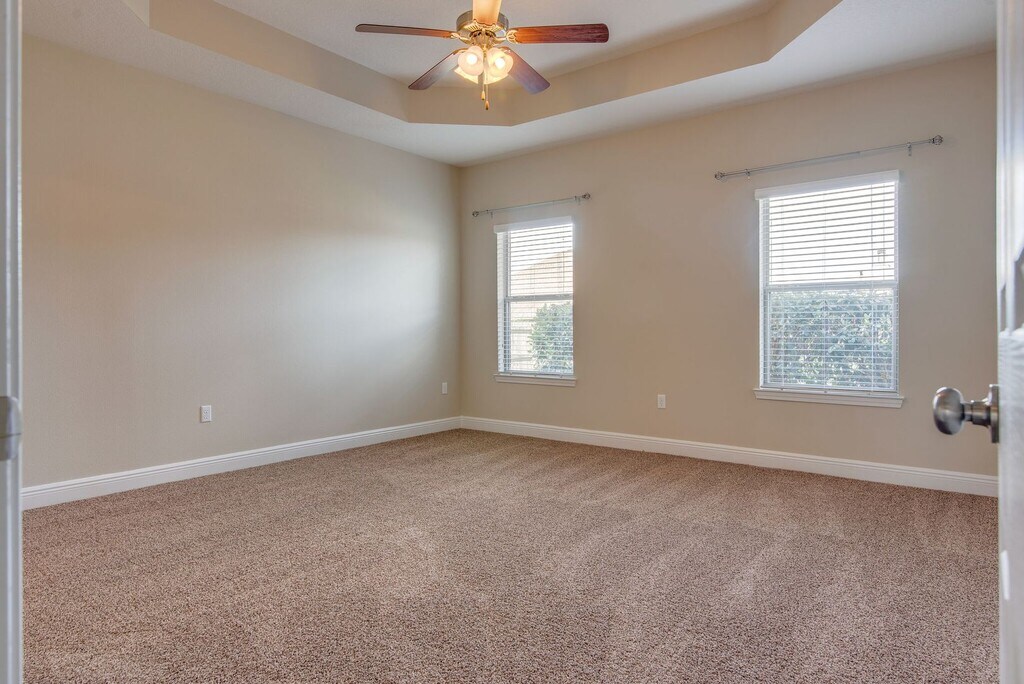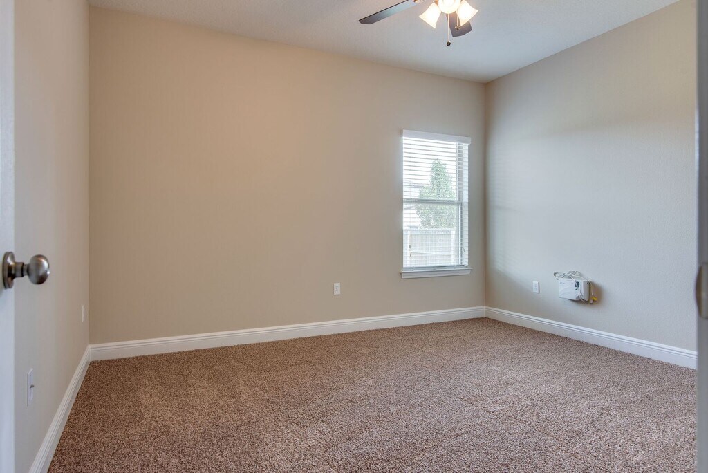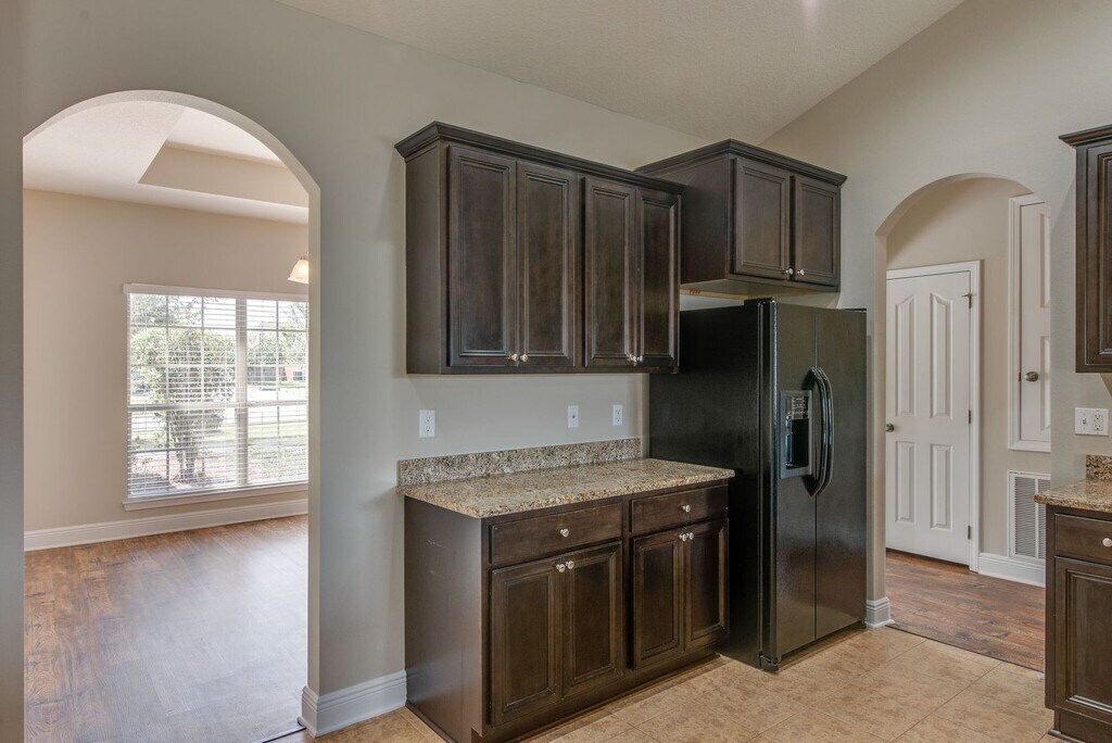 Take advantage of this impressive 2,528-square-foot home featuring 4 bedrooms, 2 full bathrooms, a formal dining room, dedicated office/flex space, and a 2-car side-entry garage. Luxury vinyl plank flooring runs throughout the main living areas, with carpet in the bedrooms for added comfort. Upon entering, you’ll be welcomed by a wide hallway accented with elegant archways. The formal dining room is located to the right, while a spacious office or flex room sits to the left. The living room features vaulted ceilings, a wood-burning fireplace, and access to the covered back patio. The stunning kitchen features tile flooring, granite countertops, dark wood cabinetry, a dual-basin undermount sink, and all essential appliances including a built-in microwave, smooth-top stove, side-by-side refrigerator, and dishwasher. Additionally, a large wraparound breakfast bar provides ample space for entertaining. The spacious primary suite includes a beautiful tray ceiling and windows overlooking the backyard. The en-suite bathroom offers a granite dual vanity, garden tub, separate shower and private water closet. Two additional bedrooms are conveniently located near a full bathroom offering a single granite vanity and tub shower combo. The fourth bedroom is privately situated upstairs above the garage and features a ceiling fan and storage closet. Additional highlights include a dedicated laundry area with space for a full size washer and dryer, a large covered back patio with fan, and a large, fully fenced backyard.