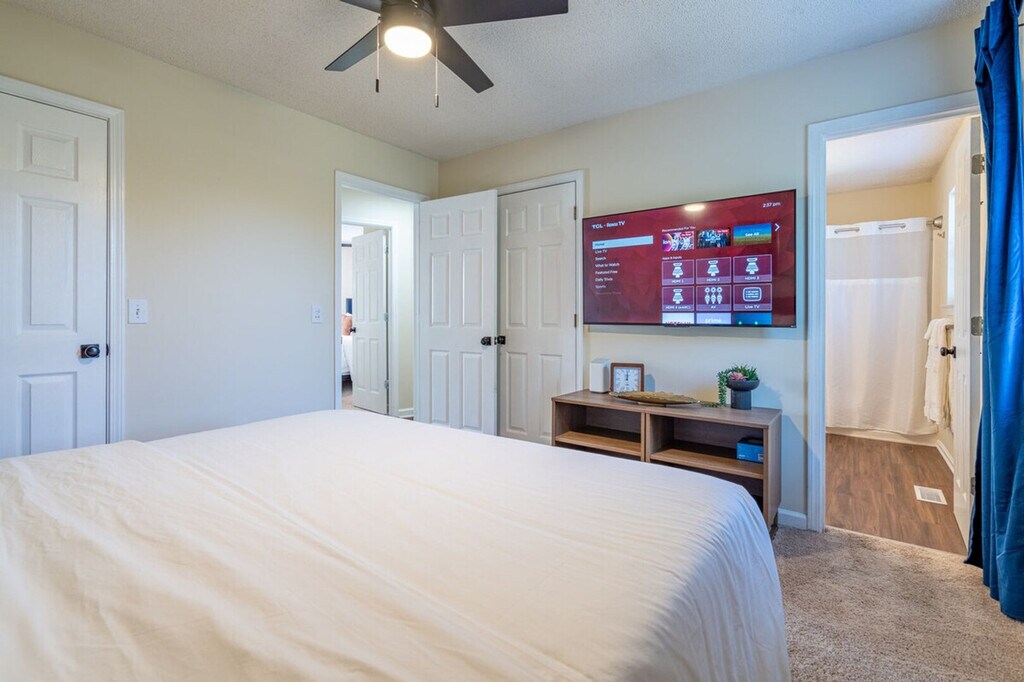 Welcome to your group’s perfect getaway in this two-story, 4-bedroom, 2-bathroom home, just 15 minutes from LakePoint Sports Complex! Ideal for families, sports teams, and group travelers, you'll feel right at home in Cartersville. The home includes a master suite with a king-size bed and smart TV, three bedrooms each with a queen-size bed and smart TV (the downstairs room includes a private lounge with sofa and chairs), a main living room with an open-concept and smart TV, a fully equipped kitchen and dining area that seats six, and a lower-level den with a pull-out sofa. Enjoy high-speed Wi-Fi throughout the property and a laundry room with a washer and dryer. A welcome basket with snacks and Keurig K-Cups is provided. Pets are considered with applicable fees: For 29 or more nights, the fee is $10 per pet, per night; for 7-28 nights, the fee is $15 per pet, per night; and for 1-6 nights, the fee is $25 per pet, per night. Enjoy the private deck with outdoor seating for four, a fire pit and grill area, and a serene backyard. Nearby attractions include LakePoint Sports Complex, Tellus Science Museum, Booth Western Art Museum, Etowah Indian Mounds, Allatoona Lake, and Bartow History Museum. Smoking and parties are prohibited. The standard cleaning fee covers the initial checkout clean. For stays of 40–60 nights, a mid-stay clean is required. For stays over 60 nights, a deep clean replaces the standard checkout clean. Any mid-stay clean, deep clean, restocking, or extra inventory requests are charged separately. [SI]
