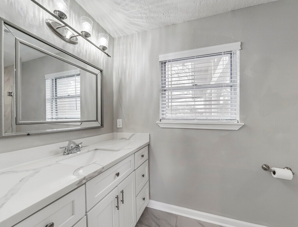 This residence features an open layout that effectively preserves bedroom privacy. The kitchen boast Quartz countertops, stainless steel appliances, and ample storage within its cabinets. The primary bedroom offers a spacious closet, an expansive shower, and built-in cabinetry. Original hardwood floors grace all three bedrooms. The living room provides a captivating view of the in-ground pool and is adorned with a stunning fireplace featuring a marble stacked-stone surround. For added seclusion, the study is equipped with sliding barn doors. The backyard pool guarantees privacy and is complemented by a complete garage bathroom. The enclosed driveway enhances the sense of privacy in this desirable neighborhood. Secure your viewing appointment today to ensure you don't miss out on this exceptional opportunity! No section 8/HUD.