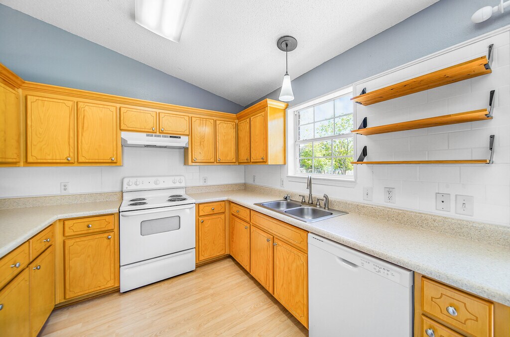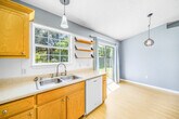 Southern and contemporary meet in this beautiful home! The living room boasts a faux brick accent wall,and flows to the breakfast/kitchen area which is flooded with natural sunlight from the expansive backyard. For your convenience there is an indoor laundry room with an "as is" washer and dryer already hooked up. The master bedroom features a wood accent wall,walk in closet,and private bath,located off of the kitchen. The two additional bedrooms are located across the house and feature beadboard and shiplap accent walls of their own. The home sits on a beautifully landscaped (.45 acre) lot,complete with a fenced back yard and beautiful mature trees. Small pet oaky with owner approval.