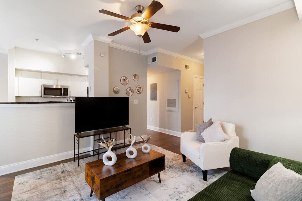 Feel at home in this stylish 2-bedroom apartment at Crest at Midtown Apartments, located in the heart of Atlanta. This apartment features a modern, open-concept layout with a gourmet kitchen equipped with stainless steel appliances and an in-unit washer and dryer for your convenience. Enjoy access to the rooftop fitness center, community pool, shared gym, and shared tennis court. One secured free parking spot is included. Located in Midtown, this apartment offers prime access to Atlanta's best. You'll be within walking distance of Colony Square's cafés, dining, and shops (8 minutes) and the High Museum of Art (10 minutes). Piedmont Park is a 15-minute walk away, and major attractions like the Atlanta Botanical Garden (5-minute drive), Atlanta Zoo (10-minute drive), and Georgia Aquarium (12-minute drive) are easily accessible. Major employers and institutions such as Georgia Tech, AT&T, and Emory University Hospital are also nearby. Smoking is prohibited within 15 feet of the property, with a $2000 penalty fee for smoking in the house or garage. Parties and events are not allowed. No unregistered guests are allowed, and any unauthorized guest is subject to a $250 per guest penalty. If the neighbors call the police due to noise disturbance, a fine of $1000 is applicable. Pets are strictly not allowed by the building management, and a violation may result in immediate evacuation and cancellation without refund. Please respect check-in and checkout times, as any unauthorized early check-in or late check-out is subject to a $250 fine. Includes a dedicated workspace ideal for digital nomads. [SI]