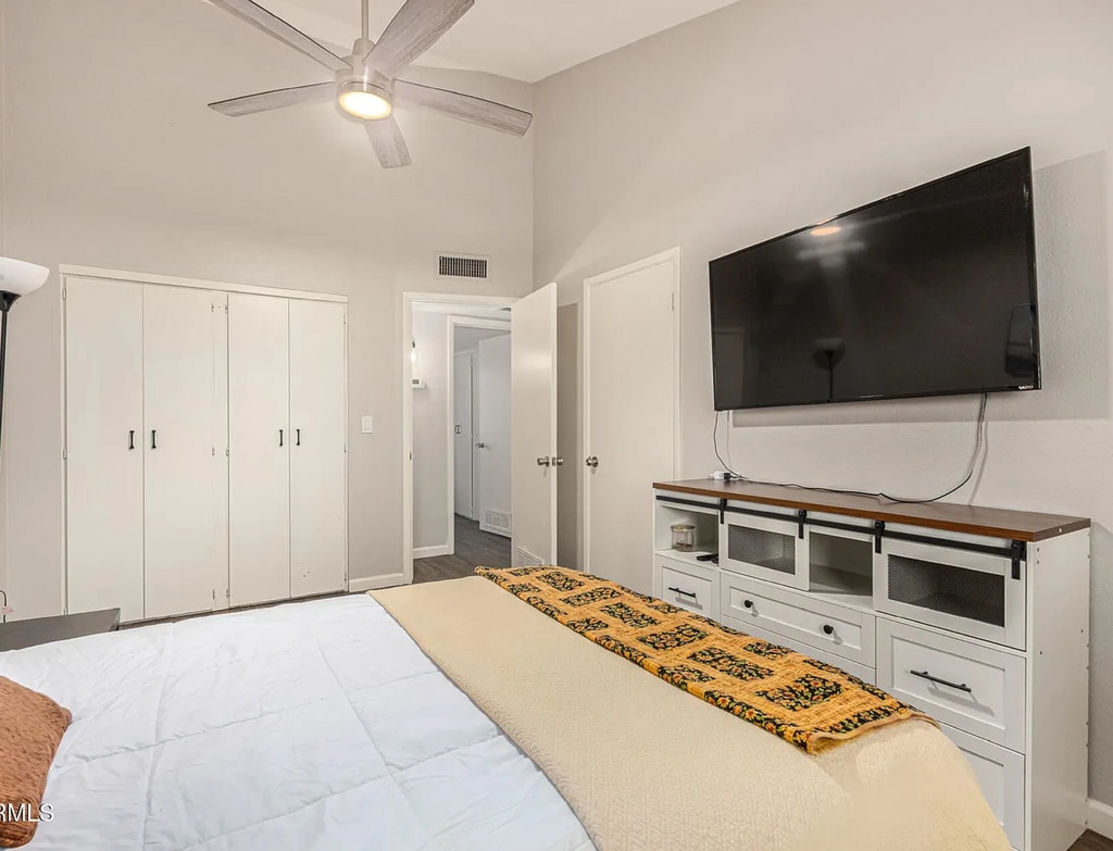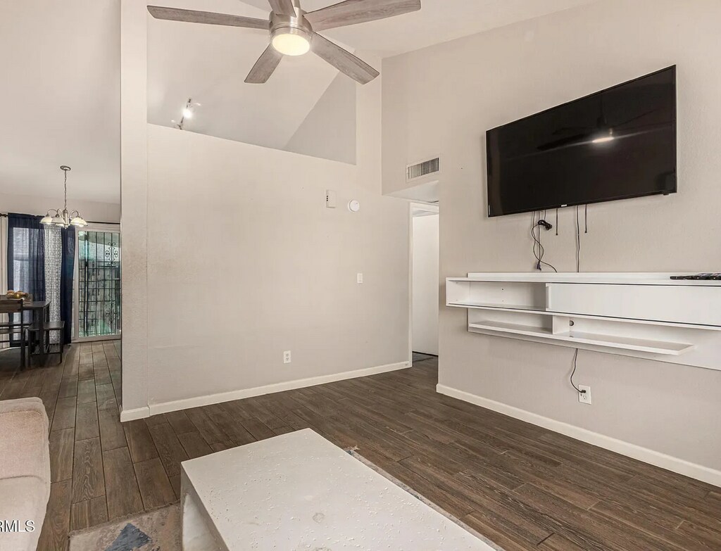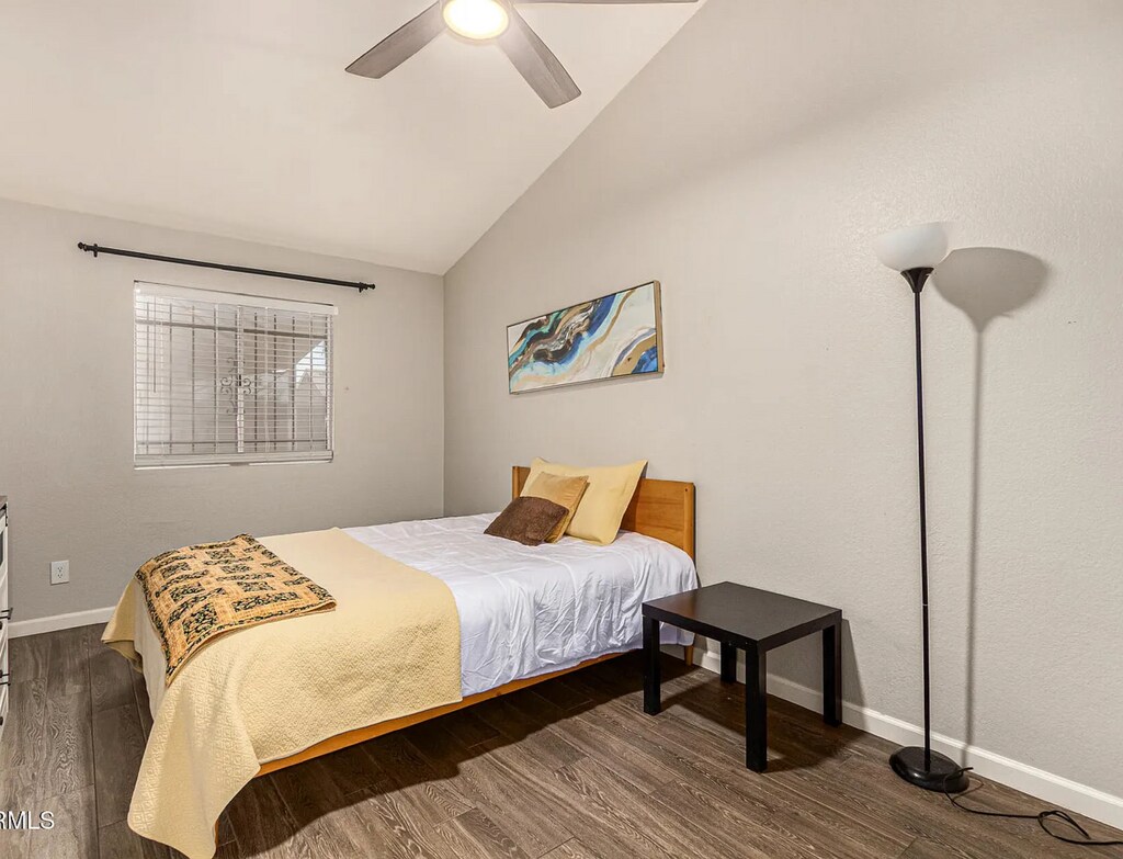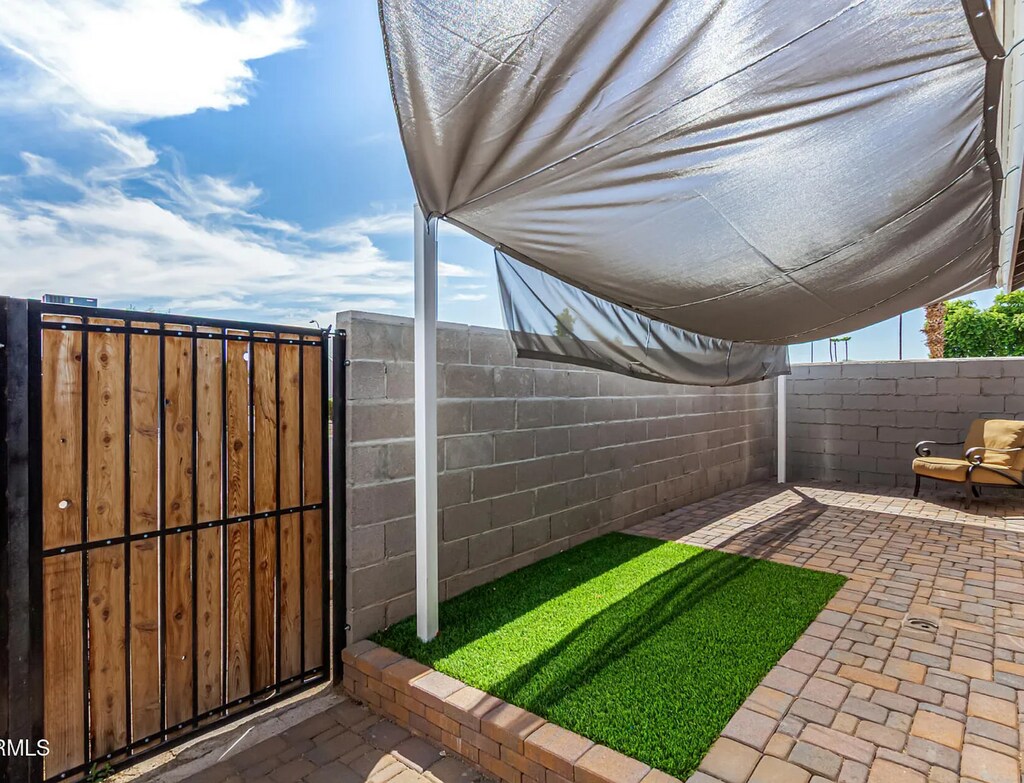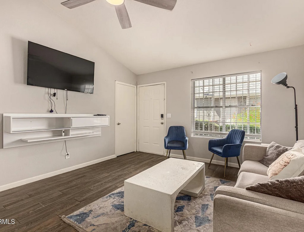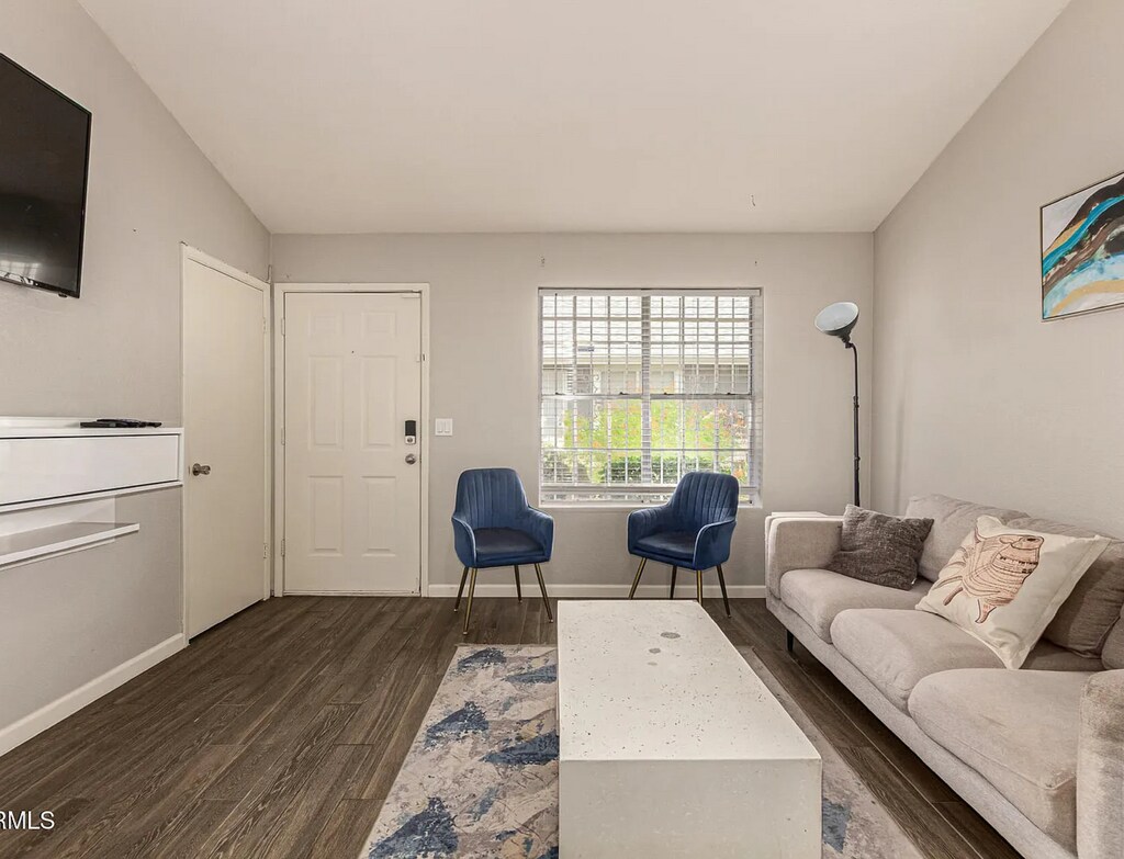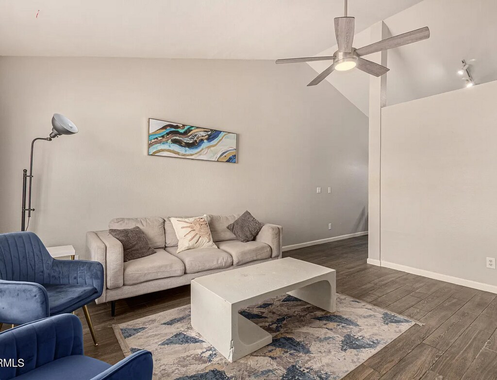 Beautiful single-level townhome with vaulted ceilings in a quiet, well-maintained Glendale complex. Fully furnished and stocked with most living essentials. Centrally located near shopping and dining. Features open floor plan, spacious bedrooms, tile wood floors, and neutral paint throughout. Remodeled kitchen (2023) with updated countertops and appliances. Large private patio with custom sail shade, pavers, and artificial grass. Includes two parking spaces (one covered). The rent includes the monthly HOA fees, which covers water, trash, and sewer services. You will need to establish your own electricity services through SRP.