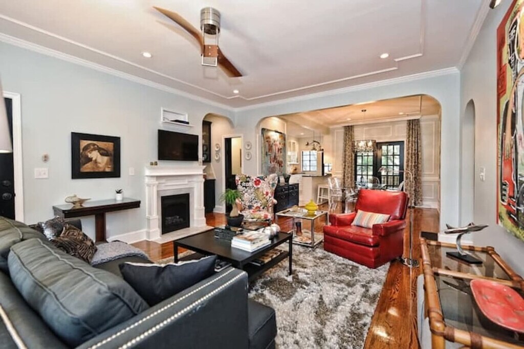 Enjoy an elegant getaway in this luxurious and spacious 2-bedroom condo, located in a classic Myers Park building just minutes from Uptown, Atrium CMC, and Novant Hospitals. Feel at home in this first-floor residence, ideally suited for executives, attorneys, relocating families, or anyone seeking top-notch accommodation for short-term or long-term stays. This home features elegant furnishings, a fireplace, state-of-the-art appliances, and ultra-fast Wi-Fi. The spacious living room includes a large upholstered sofa that converts into an additional bed and a flatscreen television equipped with streaming and Hulu + Live TV channels. The kitchen features a gas range, full-sized refrigerator, and dishwasher with double dish drawers, granite countertops, and is fully equipped with essentials. Adjacent to the living room is a well-appointed wet bar with an ice maker. The dining room comfortably seats up to eight guests and opens to a screened porch. The main bedroom has a king-size bed, a television, and two spacious closets, one of which is a walk-in. The bathroom features Carrara marble tiles, dual showers, a separate water closet, and a heated tiled floor. The second bedroom has two twin beds and a flatscreen television that can be pushed together to create one king-size bed. Included in the amenity package are a starter supply of bath products and detergents. Assigned parking is available. A workstation, including a 32” monitor, a wireless keyboard, and mouse, is available for $10 per day. If you are traveling with a dog, it must be registered at a cost of $59 per dog (two maximum). Situated just a mile away from the bustling Uptown business district, this property enjoys an idyllic location on Hermitage Court, an exclusive residential street amidst a serene park-like setting. Within a half-mile walking distance, you can find over 40 locally owned restaurants, as well as Starbucks, Panera, and Old Pancake House. The Myers Park Mile features many locally owned shops. Charlotte’s renown greenway is less than a half mile away. This home is also very close to Freedom Park, Dilworth, Plaza-Midwood, the Atrium Medical Center, and the Novant Hospital complex. SouthPark Mall is less than five miles away. Smoking any substance is strictly prohibited on the premises and may result in a $300 penalty. Our property has a zero tolerance for parties, unruly behavior, loud music, disrespectful, or unlawful activities. Violations will warrant forfeit of their entire reservation and may incur additional fees. Dogs are never allowed on the furniture or bed. If there is hair on the furniture, excess hair in the home, stains, damage, or waste found in the yard or home, you will be charged an additional fee. Please observe quiet hours from 10:00 pm to 7:00 am. A desk and ultra-fast Wi-Fi enable business travelers to stay plugged into their busy schedules. Registration Number: C31021 [SI]