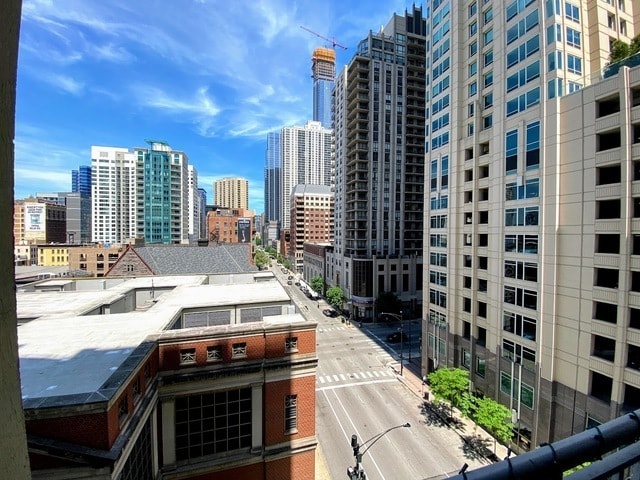 This superbly located property resides in the highly sought-after River North neighborhood, placing you within easy walking distance of all essential amenities. Situated in the northwest corner, this exquisite two-bedroom apartment boasts panoramic city vistas without any obstructions. The spacious corner living area is bathed in natural light, creating an inviting atmosphere suitable for both relaxation and hosting guests. It also features an adjacent area perfect for dining. The galley kitchen, equipped with a breakfast bar and stainless steel appliances, is ideal for whipping up your favorite meals. The primary suite offers a private retreat with a full wall of windows, hardwood floors, and ample double closets. The renovated bathroom boasts a double vanity with quartz countertops, a generous 5-foot walk-in shower, and plenty of linen storage. The second bedroom is fully enclosed and includes a walk-in closet and hardwood floors. Residents of this full-service building enjoy a wide range of amenities, including a 24-hour doorman, fitness room, sun deck, party room, hospitality suite, and on-site management. Furthermore, you'll find yourself just steps away from the vibrant retail, dining, and nightlife options that River North is renowned for. Additionally, the property is conveniently close to the red line and several CTA bus routes.