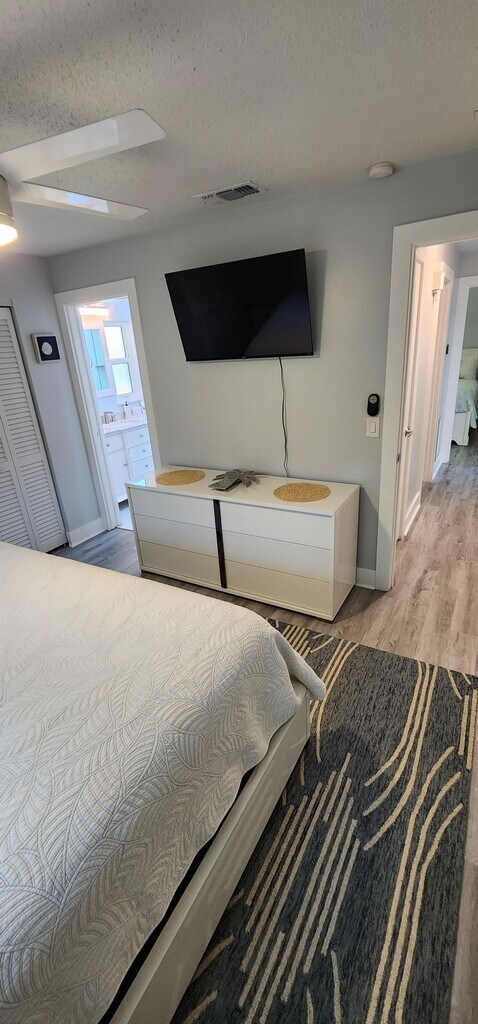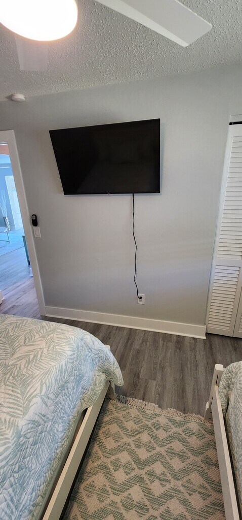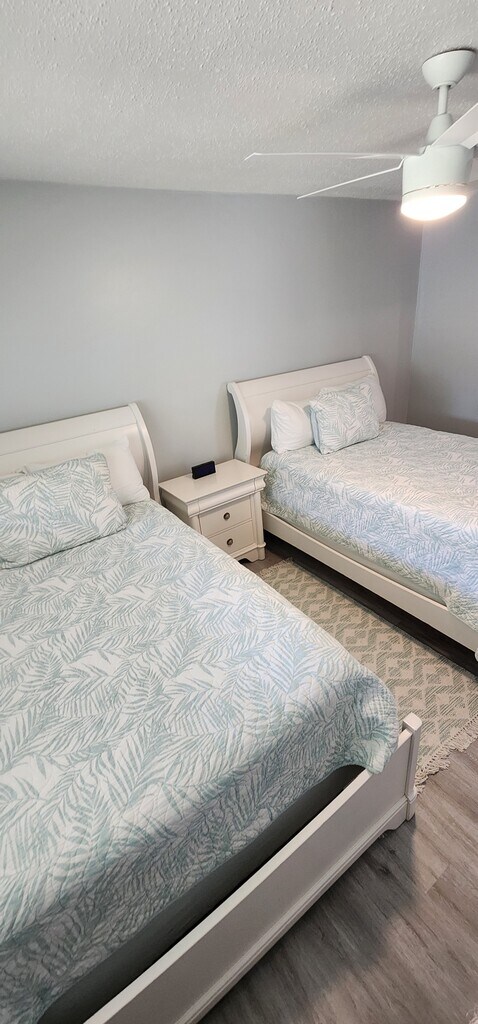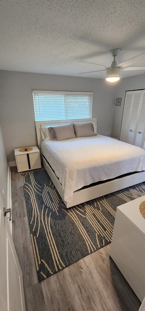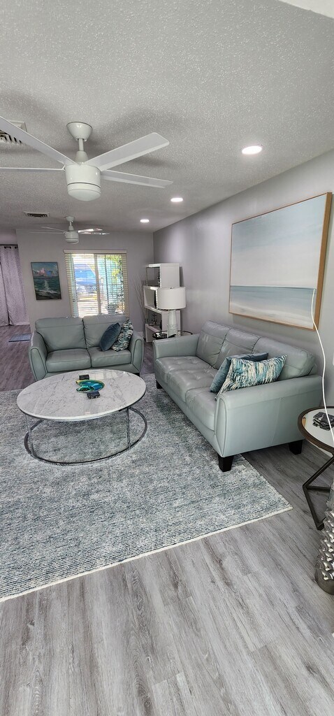 Welcome to this beautiful one-story townhouse with two comfortable bedrooms and two bathrooms. The first bedroom features a king-sized bed and a huge closet, while the second has two full-sized beds and a huge closet, providing plenty of storage space for your clothing and belongings. Both bathrooms feature one tub/shower combo and one walk-in shower so you can relax after a long day. The indoor amenities include ceiling fans throughout the house to keep you comfortable during the warm summer months. The flooring combines laminate and tile in the kitchen, making it easy to clean. The modern kitchen has all the essential appliances, a coffee maker, a microwave, a full-size fridge, and a two-person dining table. In addition to the bedrooms, the house also features a dedicated office area for those who need to work remotely and a living room that can accommodate up to six people. The living room is perfect for relaxing and watching TV after a long day exploring nearby beaches and restaurants. Step outside and enjoy the beautiful sunroom, fully furnished and perfect for enjoying the Florida weather. This townhouse is centrally located, making it easy to access all the nearby attractions. It's just a short drive away from the beach and great restaurants. Please note that cleaning services are available at an additional cost. Don't miss out on the opportunity to call this place yours. Contact the us to book your stay today and come and see this beautiful townhouse for yourself and enjoy all the amenities it has to offer!