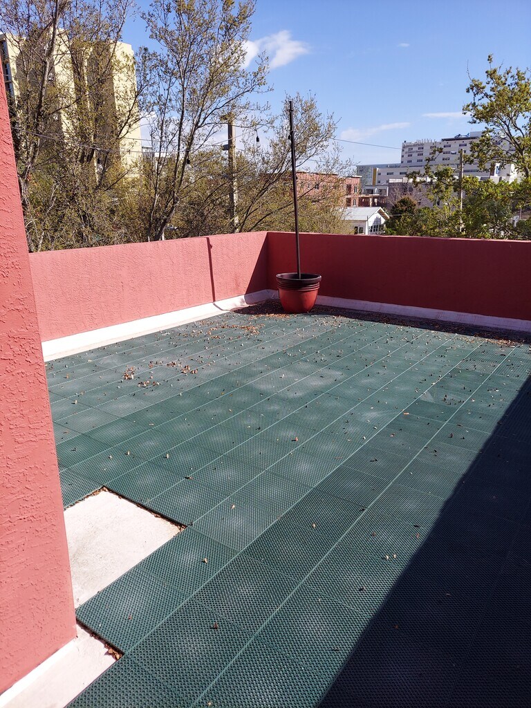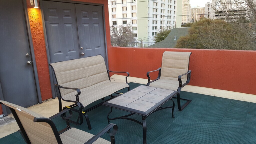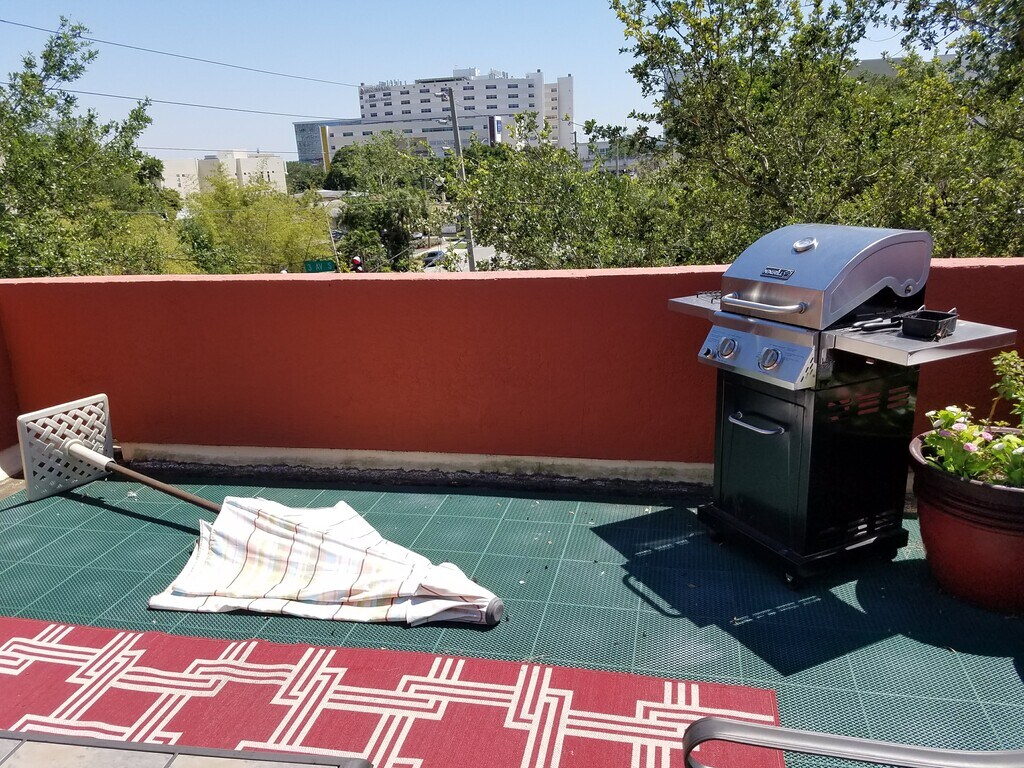 Spacious Townhouse 1555 square feet interior space plus a private 580 square feet outdoor living space rooftop terrace. It has 3 levels of living space to enjoy. It's located in this great central downtown location. This is the end townhouse. It is the only unit with extra natural light from side windows. Only 3 blocks to Johns Hopkins All Children's Hospital, Publix, 4 blocks from specialty shops and restaurants on Central Avenue. Rowdies Soccer, St. Petersburg Pier, and museums are all in walking distance. The first level features a living room 14 x 16 feet with a hardwood floor, LED ceiling fan, and bar. The tiled kitchen 10 x 11 feet has granite countertops, stainless stainless steel refrigerator, microwave, dishwasher, disposal, and IKEA Island with storage for pots and pans and seating for 2, full size washer/ dryer, modern style 1/2 bathroom. The dining room 15 x 16 feet has hardwood floors, and a modern IKEA light fixture. The second level master bedroom 14 x 15 feet, has laminate flooring, fan, and features a Juliet balcony, 2 closets, TV nook, and has an attached bathroom with tub and shower, LED lighting, and storage closet. The guest bedroom 12 x 15 feet has laminate flooring, LED fan, 2 closets, and attached bathroom with a tub and shower. Extra storage is available by the spiral staircase on the second level. The 3rd level outdoor living space has 580 square feet to enjoy with an enclosed sink, storage, electricity for a small refrigerator and plenty of space for your BBQ. You and your guests will enjoy the beautiful city views, and the city lights after sunset.