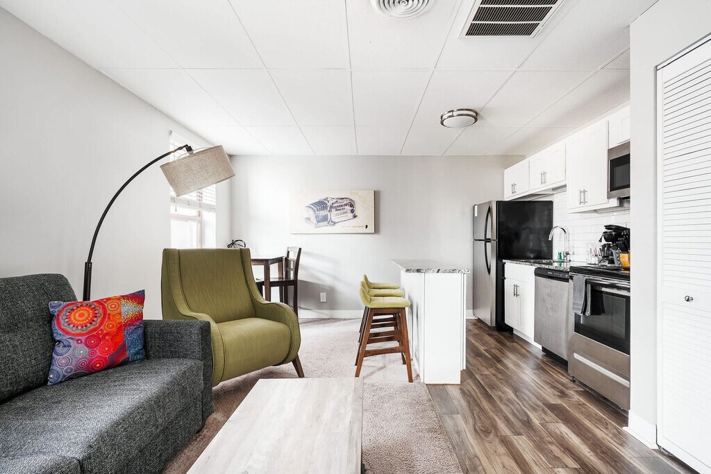 Welcome to this charming 2-bedroom apartment in Indianapolis! Feel at home in this centrally located apartment on bustling Massachusetts Avenue. This apartment features a fully equipped kitchen, a cozy living room with a pull-out sofa, a 55" smart TV, high-speed Wi-Fi, central heat and air, and a Ring doorbell on the outside of the door. A washer and dryer are available in the building. Parking passes are available for purchase at a rate of $20 per night, $100 per week, and $250 per month. Please contact us in advance to reserve a spot as spaces are limited. The Argyle on Mass Ave is a vibrant neighborhood known for its arts, culture, dining, and entertainment. With historic buildings, eclectic boutiques, art galleries, and diverse dining options, it offers a lively and engaging atmosphere. Indy offers various convenient transportation options including car, public transit, biking, taxis, ride-sharing, and walking. The heating system is louder than average when running, earplugs are recommended for light sleepers. No parties and no smoking are permitted in the property, and will incur a $1000 fine. Quiet hours are from 10pm to 6am. Please be respectful of our neighbors and keep noise levels down. Pets are welcome with a fee of $20 per night, $100 per week, or $250 per month, and must be potty-trained dogs, preferably under 50 lbs. Clean up after your pet and keep your dog on a leash in common areas. Violating these rules may result in eviction without a refund. [SI]