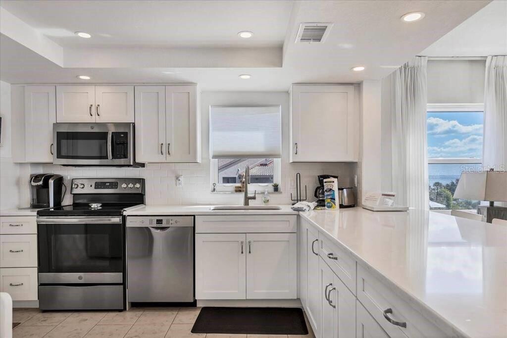 Completely remodeled in 2019. Endless Gulf views from every room. TWO queen sized beds in Master,two twins in second bedroom means plenty of space for your family,and everything is new and sparkling clean! Additional Person fees may apply. Enjoy a dip in one of the largest pools on Siesta Key! This second floor apartment has direct gulf views for stunning sunsets of the only beach to be voted #1 twice by Dr. Beach! Walk to Crescent Beach. Village restaurants and shops,with Siesta Key Village just a short drive north on the key. MLS# TB8466866