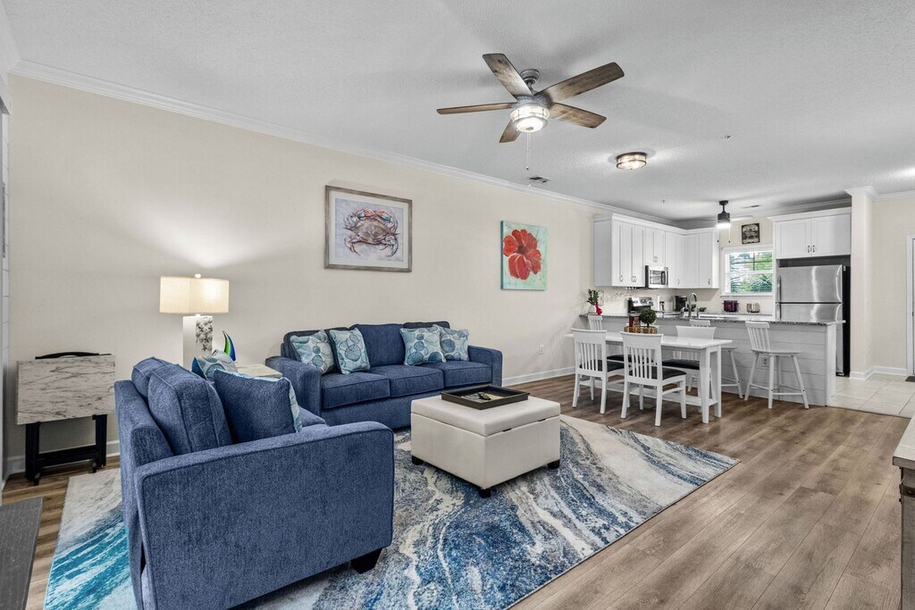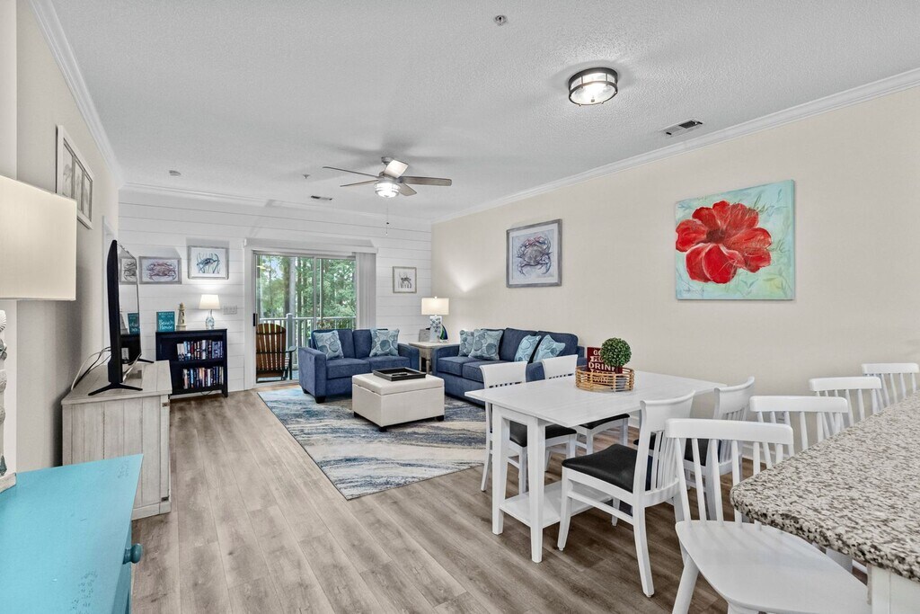 6253 Catalina Dr Unit 422 – North Myrtle Beach, SC Fully furnished 2-bedroom, 2-bath condo available for mid-term rental in the Barefoot Resort community. This second-floor unit offers an open floor plan with a bright living area, well-equipped kitchen, and private screened-in balcony overlooking the golf course. The primary suite features a comfortable king bed, walk-in closet, and private bath, while the guest bedroom includes twin beds and easy access to the second full bathroom. Washer and dryer are included for convenience. Located in the desirable Barefoot Resort, residents enjoy access to community pools, walking trails, and shuttle service to the beach. Perfect for traveling professionals, relocations, or anyone seeking a 1–6 Fall / Winter Season stay. 2 Bedrooms | 2 Bathrooms | Fully Furnished | Resort Amenities | Beach Shuttle
