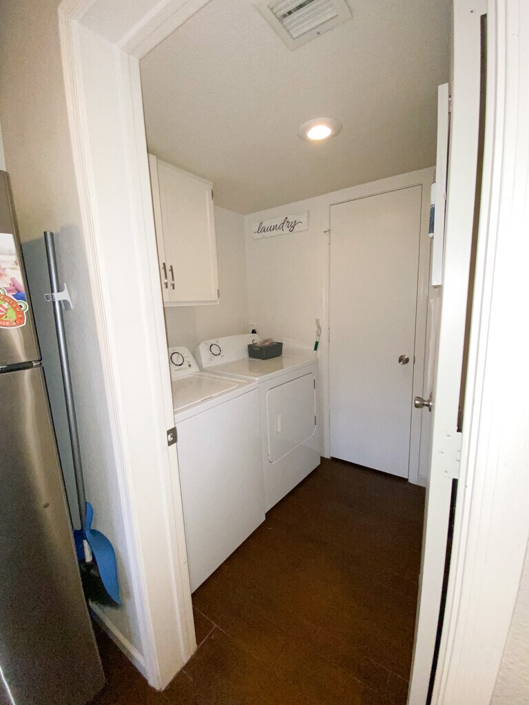 Townhome with two levels and tile entry Beautiful 3 bedroom,2.5 bath home Living room fireplace Kitchen w/ tile floors,range/oven,dishwasher,disposal and refrigerator Dining room w/ a ceiling fan Bedrooms have vaulted Ceilings Master bed and bath upstairs w a walk in closet and double sinks in the bath NO front yard; rear yard has a covered patio Inside laundry closet w/ washer and dryer included! End unit Common area pool and spa New carpeting and window coverings