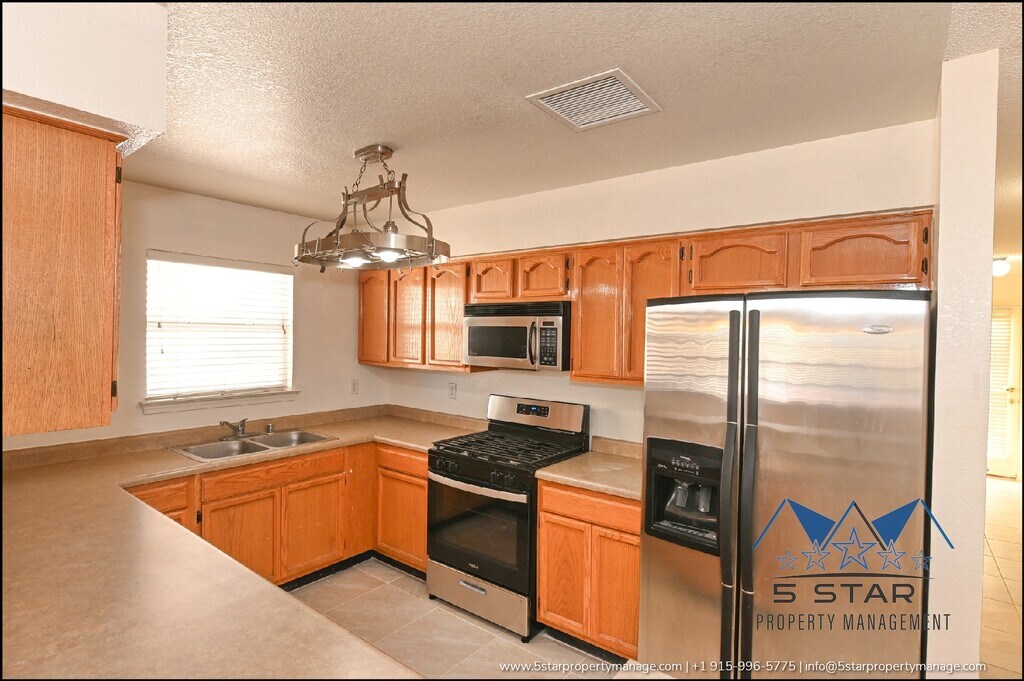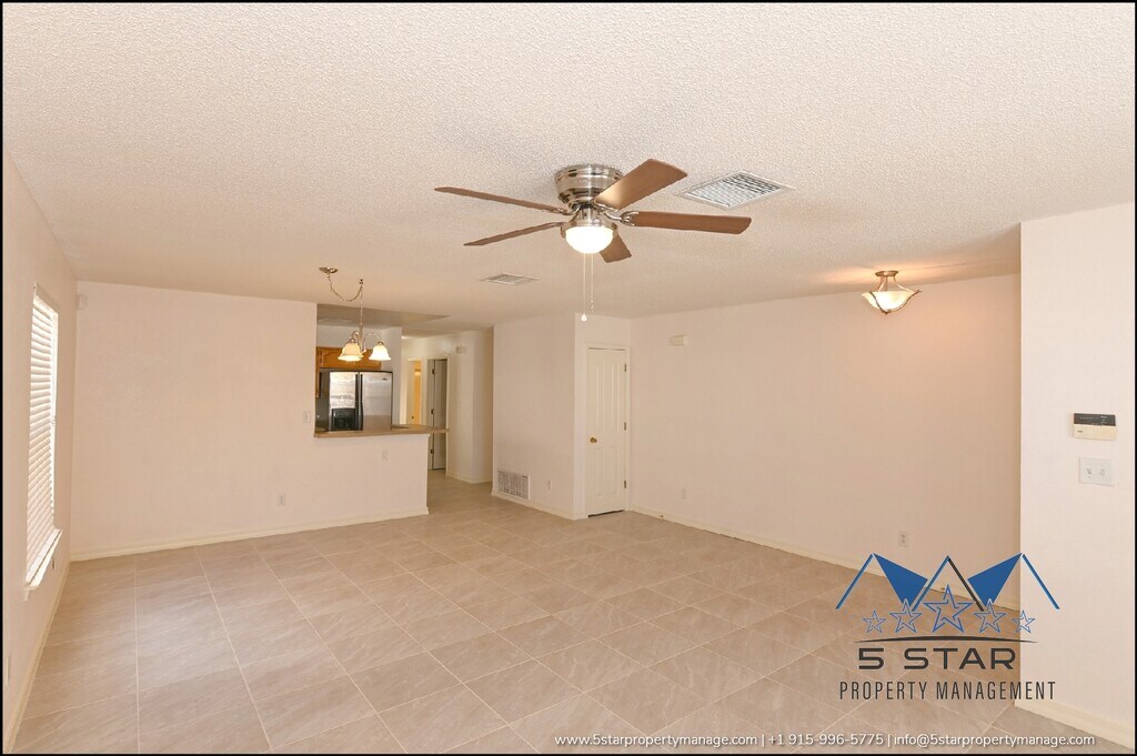 A clean-lined facade and desert landscaping set the tone for this efficient 3-bedroom, 2-bath single-story home. Inside, an open living-dining area spans durable tile floors, keeping upkeep simple and the flow effortless. The kitchen stays connected with a bar opening, ample cabinetry, and stainless refrigerator alongside range, microwave, and dishwasher. A cozy fireplace anchors the main living space for cooler evenings, while refrigerated cooling supports comfort when temperatures climb. The primary bedroom is positioned for privacy with an en-suite bath, and two additional bedrooms provide flexible space for a studio, office, or guest room. Laundry is streamlined with included washer and dryer. A spacious private backyard invites outdoor seating and weekend unwinding, plus the bonus of an attached garage. Close to Rio Plaza and convenient Doniphan-area routes for quick errands. Deposit-Free Renting service to Obligo qualified renters, fees may apply. For Showings information and availability, please call at By: 5 Star Property Management | EL PASO Texas Rentals | EL PASO Property Management | Property Management in EL PASO *Important: Information is deemed reliable but not guaranteed. All information is submitted subject to errors, omissions, change of price before the lease, or withdrawal without notice.