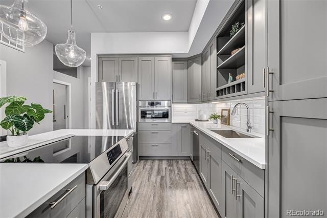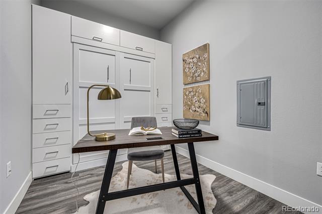 Experience luxury living in this stunning 1-bedroom + nonconforming bedroom/office condo in the Met South building of the highly desirable Lowry Boulevard One. This spacious, south-facing unit offers an open-concept layout with premium finishes throughout. The main bedroom suite boasts a private bathroom with a walk-in closet, floor-to-ceiling windows, and 10-foot ceilings, filling the space with natural light. The additional nonconforming bedroom comes equipped with a custom-built Murphy bed, pocket door and storage, making it ideal for a home office, guest room, or flex space. The contemporary kitchen is beautifully appointed with Bosch appliances, ample soft-close cabinetry with 14 deep uppers, a pantry, white quartz countertops, a stylish tile backsplash, and durable LVT flooring. Adjacent to the kitchen, the in-unit laundry room includes built-in shelving, a washer, and a dryer for added convenience. Step outside to your private covered balcony and take in views of the lushly landscaped surroundings. The condo includes 2-car tandem parking in a secured underground garage and a same-floor storage unit just steps away. Situated in an unbeatable location, this condo offers easy access to Crestmoor Park just across the street, while the vibrant Boulevard One shops, restaurants, and Lowry Beer Garden and Clark’s Market are a short walk to the east. Hangar 2’s diverse dining options, including North County, Officer’s Club, and Rocket Ice Cream, are just hop skip and a jump away, making this a perfect home for a lock-and-leave, low-maintenance lifestyle." Condominium MLS# 9775416