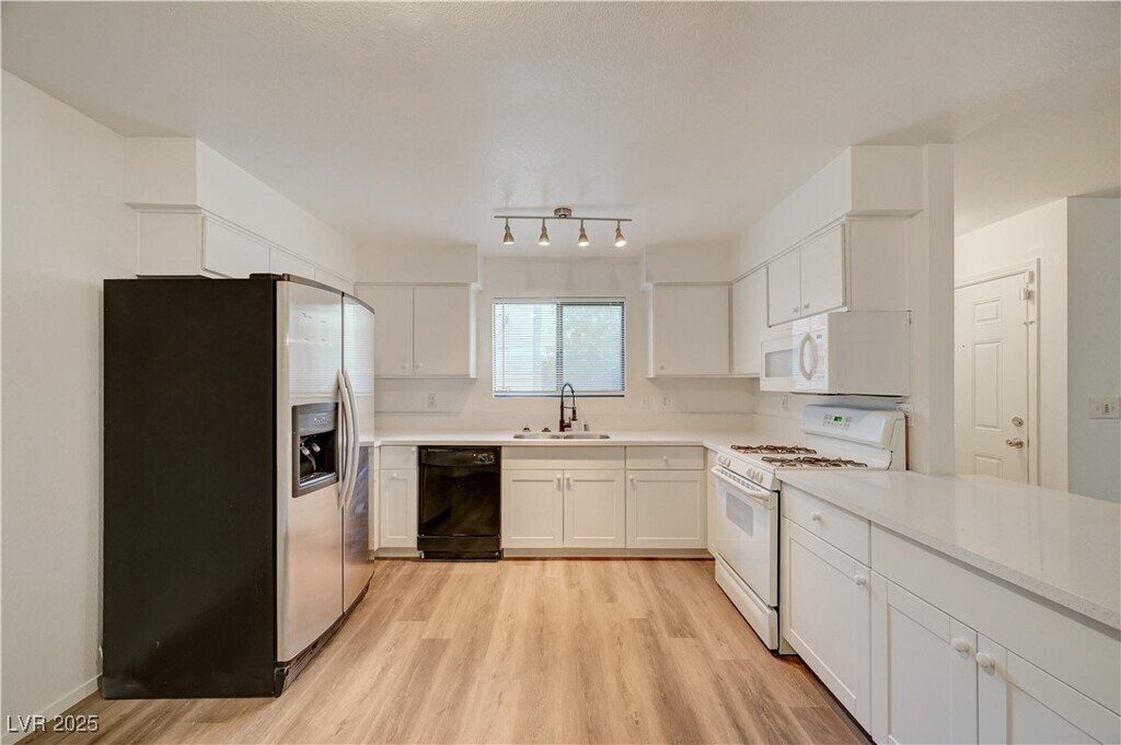 Welcome to this beautifully remodeled ground-floor residence, ideally situated near Charleston and Rainbow. This spacious 2-bedroom, 2-bathroom unit offers the perfect blend of comfort and convenience in a serene, well-maintained community featuring lush green spaces, a sparkling pool, and a relaxing spa. The interior boasts stylish wood like luxury vinyl plank flooring throughout the main living areas, a cozy fireplace, and ceiling fans for year-round comfort. The modern kitchen comes equipped with a sleek stainless steel refrigerator, microwave, quartz countertops, and includes a full-size washer and dryer. Additional perks include a dedicated storage area and private patio space. This move-in ready unit offers exceptional value in a desirable location.