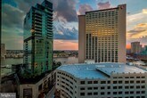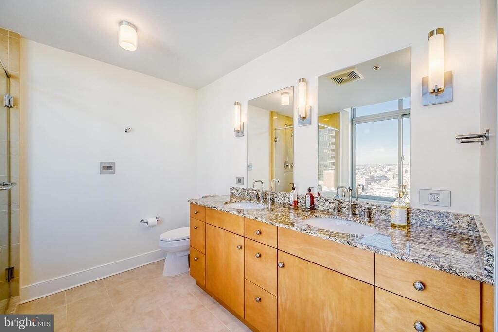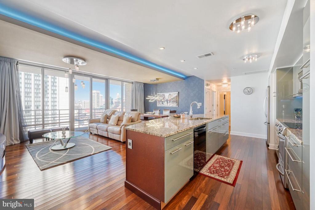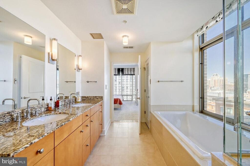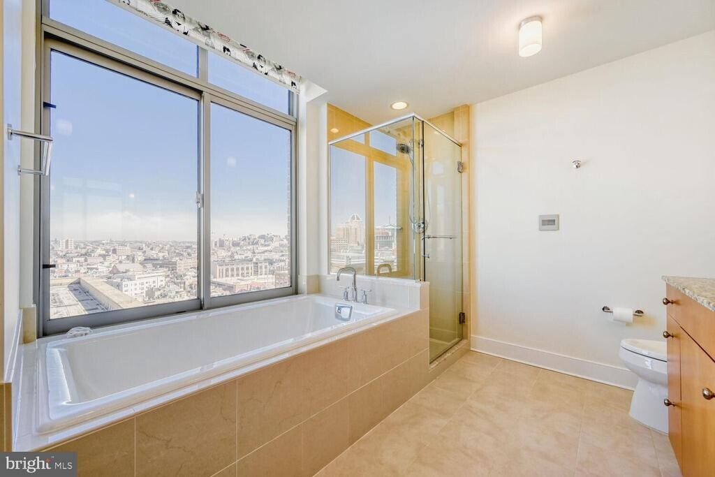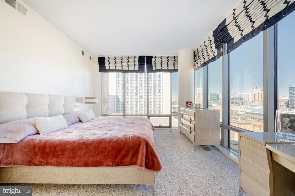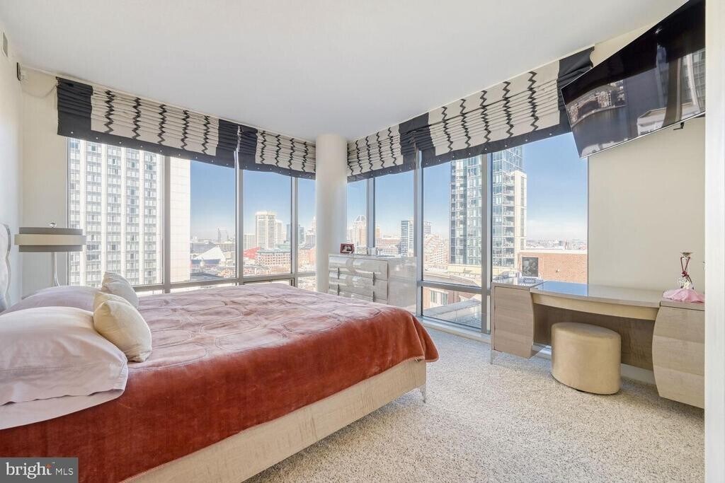 Experience elevated city living in this spectacular corner two-bedroom, two-bath residence at The Vue, ideally positioned in the heart of Harbor East with sweeping water and skyline views. Framed by oversized windows, this exceptional home captures breathtaking vistas of the Inner Harbor, Patapsco River, and cityscape, creating a stunning backdrop from sunrise to sunset. Designed with both sophistication and comfort in mind, the residence features a newly renovated gourmet kitchen with sleek custom finishes, an expansive island perfect for entertaining, and seamless flow into the open-concept living and dining spaces. Every detail has been thoughtfully curated, including designer lighting, upgraded flooring, and striking custom wallpaper, all contributing to its triple mint condition. The spacious living area extends effortlessly to an expansive private balcony, offering the perfect setting for morning coffee, evening cocktails, or simply taking in the vibrant waterfront energy below. Motorized blinds and custom drapery add both convenience and elegance throughout the home. The luxurious primary suite is a true retreat, featuring dramatic corner windows, a walk-in closet, and a spa-inspired bath complete with a soaking tub and glass-enclosed shower. A generous second bedroom and full bath provide flexibility for guests, a home office, or additional living needs. One covered parking space is included. Residents of The Vue enjoy unrivaled convenience in one of Baltimore’s most sought-after neighborhoods, just steps from the city’s finest dining, boutique shopping, Whole Foods, Starbucks, the waterfront promenade, nightlife, Harbor East Cinemas, and direct elevator access to the MAC gym. A rare opportunity to lease a fully customized, move-in-ready luxury waterfront residence in one of Harbor East’s premier full-service buildings.