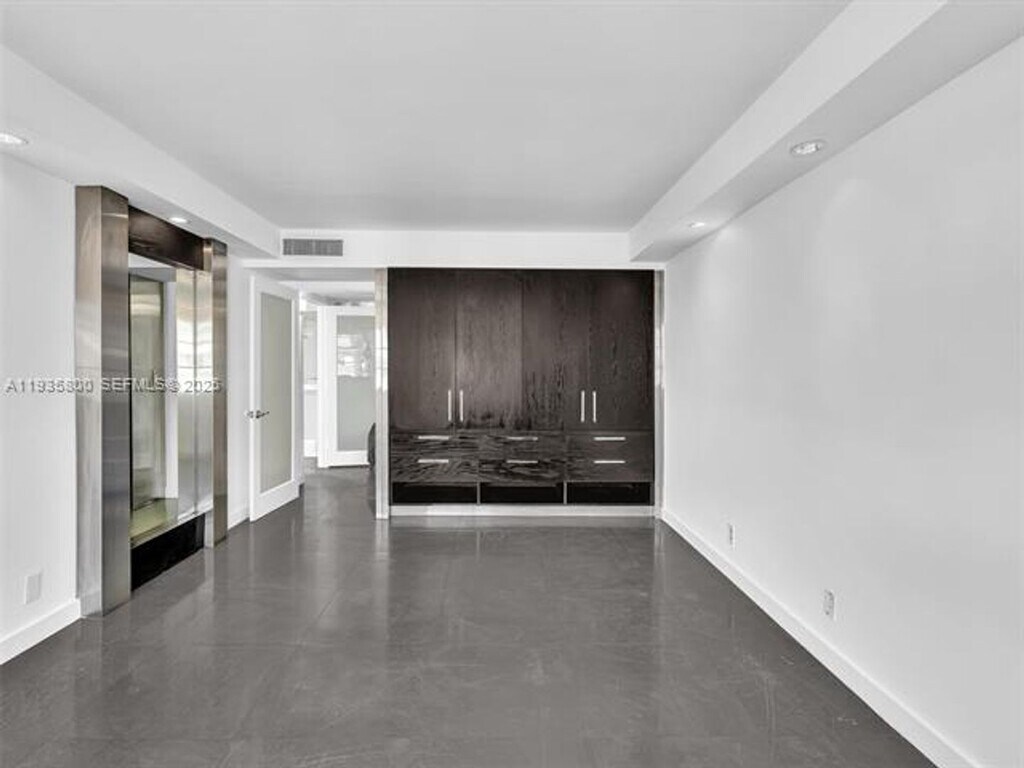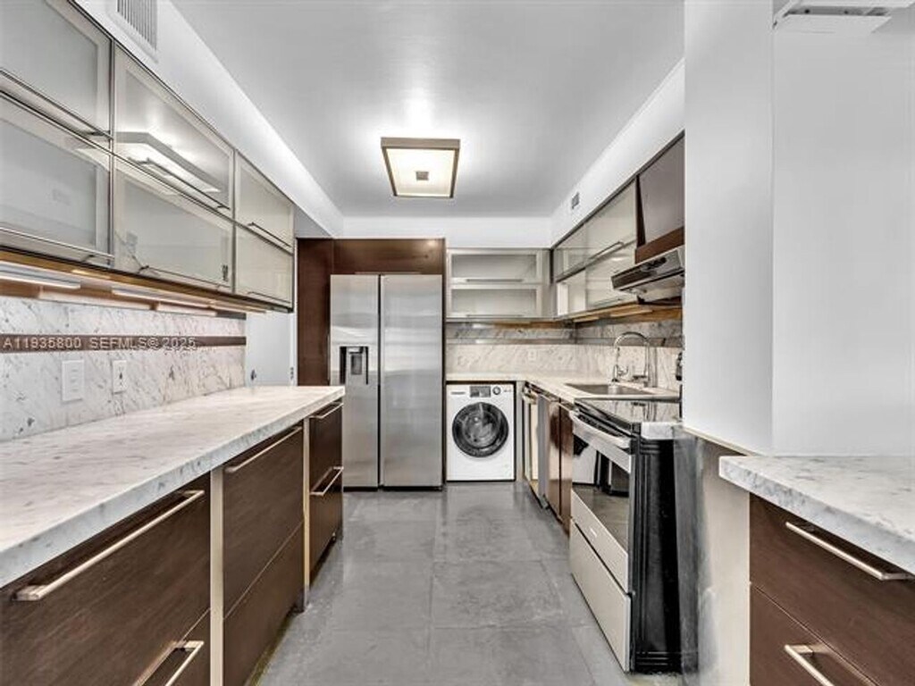 Courtesy of Compass Florida, LLC Posted by Andrew Coleman with EXP Realty . This unique & elegant home showcases architectural glass details throughout -- including custom doors, partitions, and closets -- creating an open, contemporary flow enhanced by exceptional natural light. The spacious floor plan offers a seamless living and dining experience ideal for entertaining, complemented by recessed lighting, hurricane impact/soundproof windows and sliding doors, ceramic and wood flooring, kitchen with new appliances and veined marble countertops, and in-unit washer/dryer. Two spa-style bathrooms are finished with natural stone, vessel sinks, and modern fixtures -- one featuring a frameless glass walk-in shower .