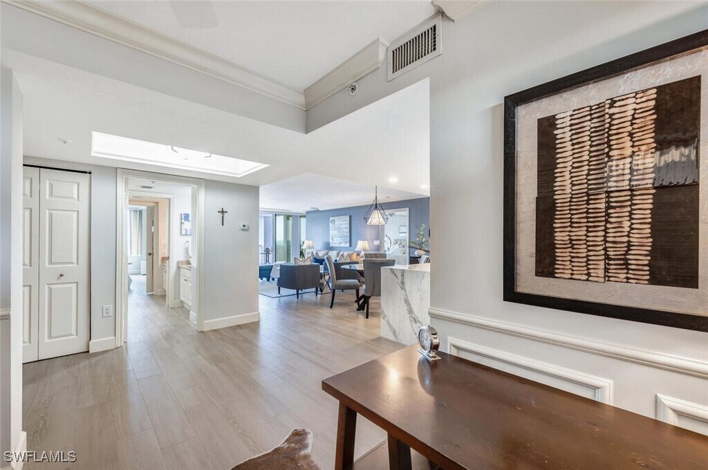 Stunning 18th-floor condo in the prestigious St. Laurent offers panoramic,unobstructed views of the Gulf and breathtaking sunsets. Designed with elegance and comfort in mind,this spacious residence features two master suites,a custom bar area with a wine refrigerator and quartz countertops,and ample storage,including a large pantry. The first master suite is a true retreat,with an extended living area ideal for an office or exercise space,along with exquisite wallpaper accents,three closets,dual vanities,a large soaking tub,and a walk-in shower. The second master suite boasts a generously sized walk-in closet and a luxurious walk-in shower. Both suites offer privacy and comfort,with sweeping views from every window. The expansive,extended balcony provides the perfect setting for entertaining,offering plenty of space for dining and lounging with seating for eight guests. The kitchen features a large bar area with ample seating,perfect for gatherings and casual meals. St. Laurent Amenities - • Private pickleball and tennis courts. • Assigned garage parking. • Heated pool and spa. • Access to Beach Tram. • Active social committee managing a variety of entertainment activities. Pelican Bay Amenities - • Two private beach dining clubs with access for you and 6 guests. • Chair and umbrella service at the beach. • Complimentary use of kayaks,paddle boards,sailboats,and Hobie Cats. • Beachfront entertainment four nights a week during season. • Community center with yoga,fitness classes,bridge,book clubs,Mahjong,art classes and more. • A thriving tennis community with 18 Har-Tru courts. • 20 Pickleball courts. This exceptional residence combines luxury,comfort,and an active lifestyle,all within one of Naples' most sought-after communities.